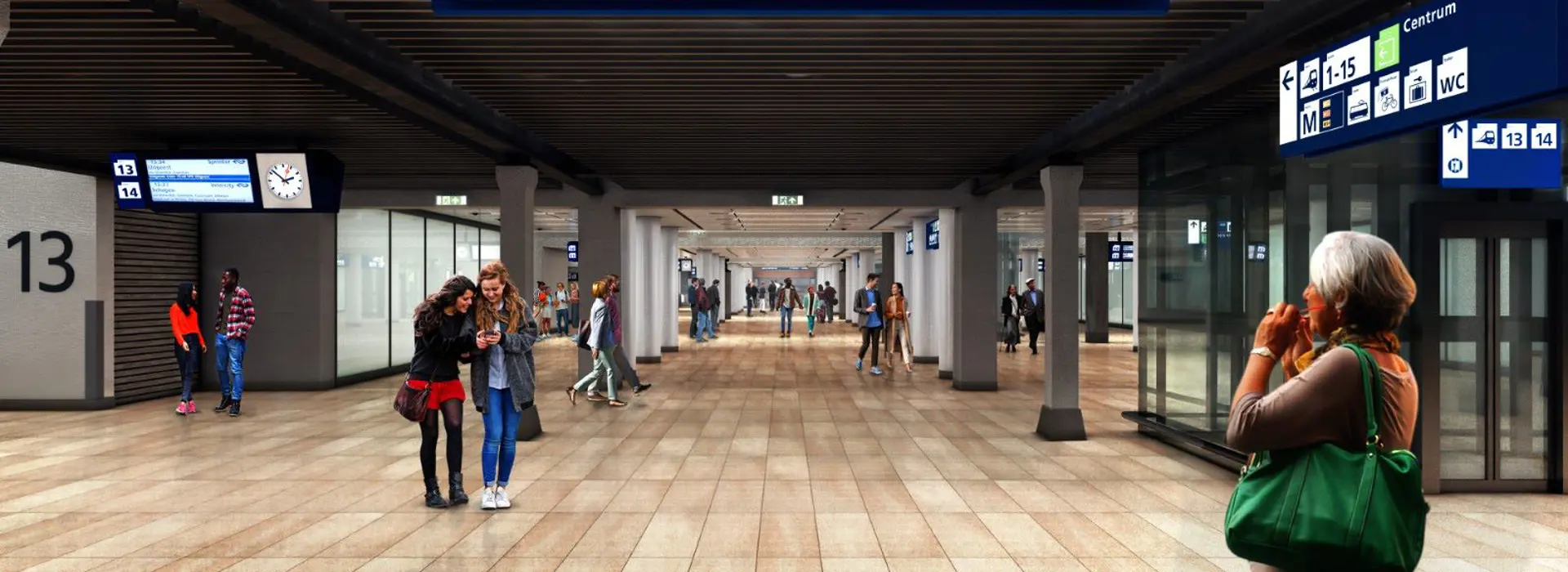 De huidige oostelijke reizigerstunnel is smal. Deze wordt drie keer zo breed gemaakt en voorzien van winkels. Naast de oostelijke reizigerstunnel, bouwen we ook een nieuwe fietsenstalling voor ruim 8500 fietsen. Deze maken we tegelijkertijd met het vervangen van de bruggen en de ombouw van de sporen. Tussen deze nieuwe fietsenstalling en de vernieuwde oostelijke reizigerstunnel, komt een nieuwe toegang zodat reizigers snel vanuit de fietsenstalling het perron op kunnen lopen.