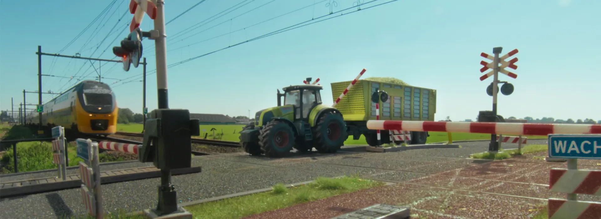 Wij delen liever geen beelden van aanrijdingen tussen treinen en zwaar vervoer in deze campagne. Dat is te traumatisch voor betrokken bestuurders en machinisten. Een aanrijding op het spoor heeft namelijk veel impact. Zowel fysiek als emotioneel. Daarom maakten wij voor onze campagne gebruik van modelvoertuigen. Zo kunnen we gevaarlijke situaties laten zien, zonder gevaarlijke situaties te creëren.