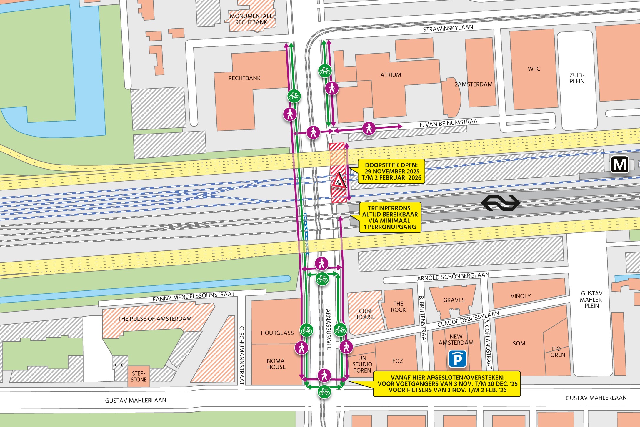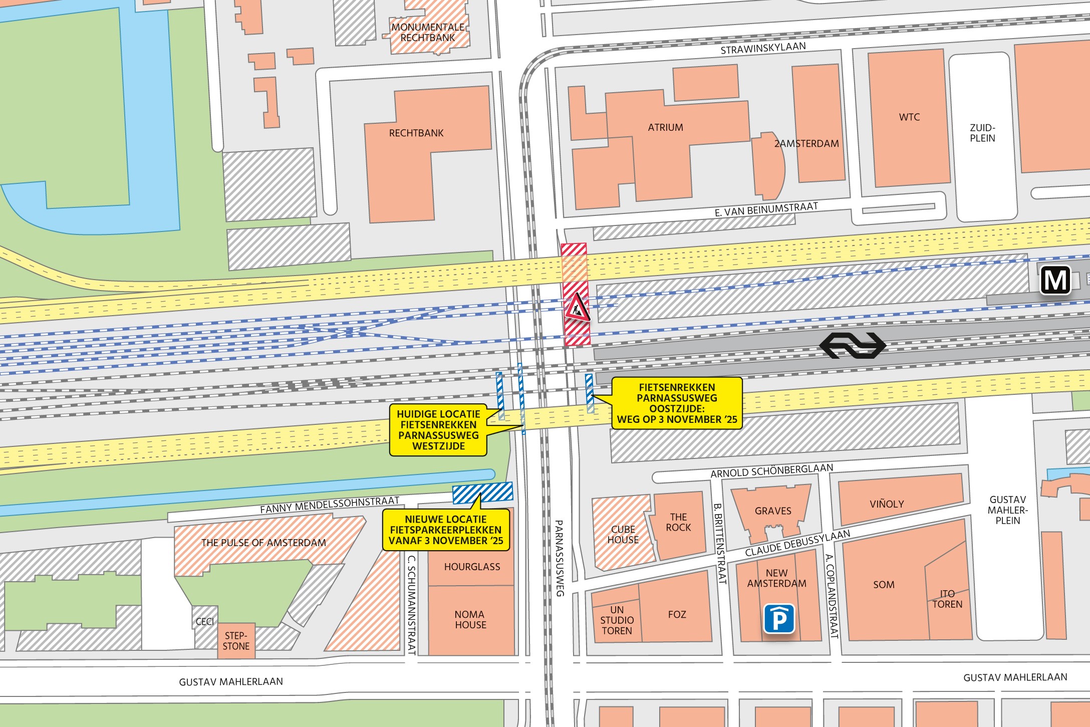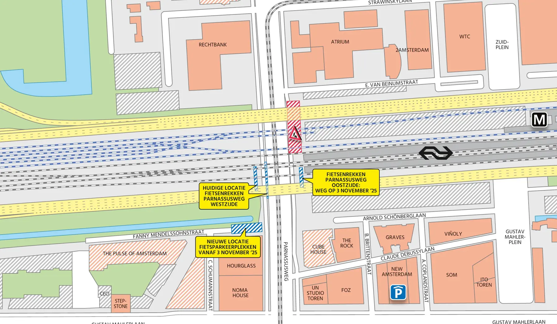 Fietsers aan de stationskant van de Parnassusweg worden vanaf maandag 3 november omgeleid via de andere kant van de Parnassusweg. De fietsparkeerplekken onder het viaduct bij de perronopgangen worden op 3 november verplaatst naar een plek naast gebouw Hourglass. Even verderop onder het viaduct staan nu al 11 fietsenrekken. In deze periode zijn ook de perronopgang en het voetpad onder het viaduct af en toe afgesloten.