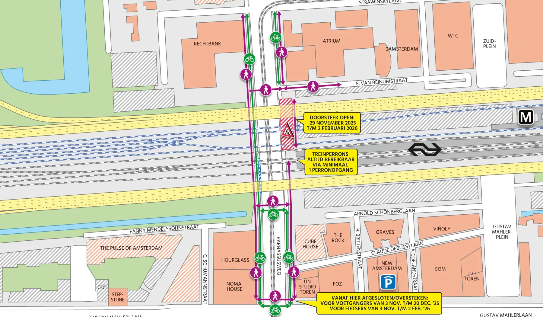 Uit veiligheidsoverwegingen sluiten we het fiets- en voetpad aan de oostzijde van de Parnassusweg voor langere tijd af. Om precies te zijn tussen de Arnold Schönberglaan (zuidzijde viaduct) en de Eduard van Beinumstraat (noordzijde viaduct). Ook zijn de perrons in bepaalde periodes niet bereikbaar via de ov-poortjes vanaf de Parnassusweg.