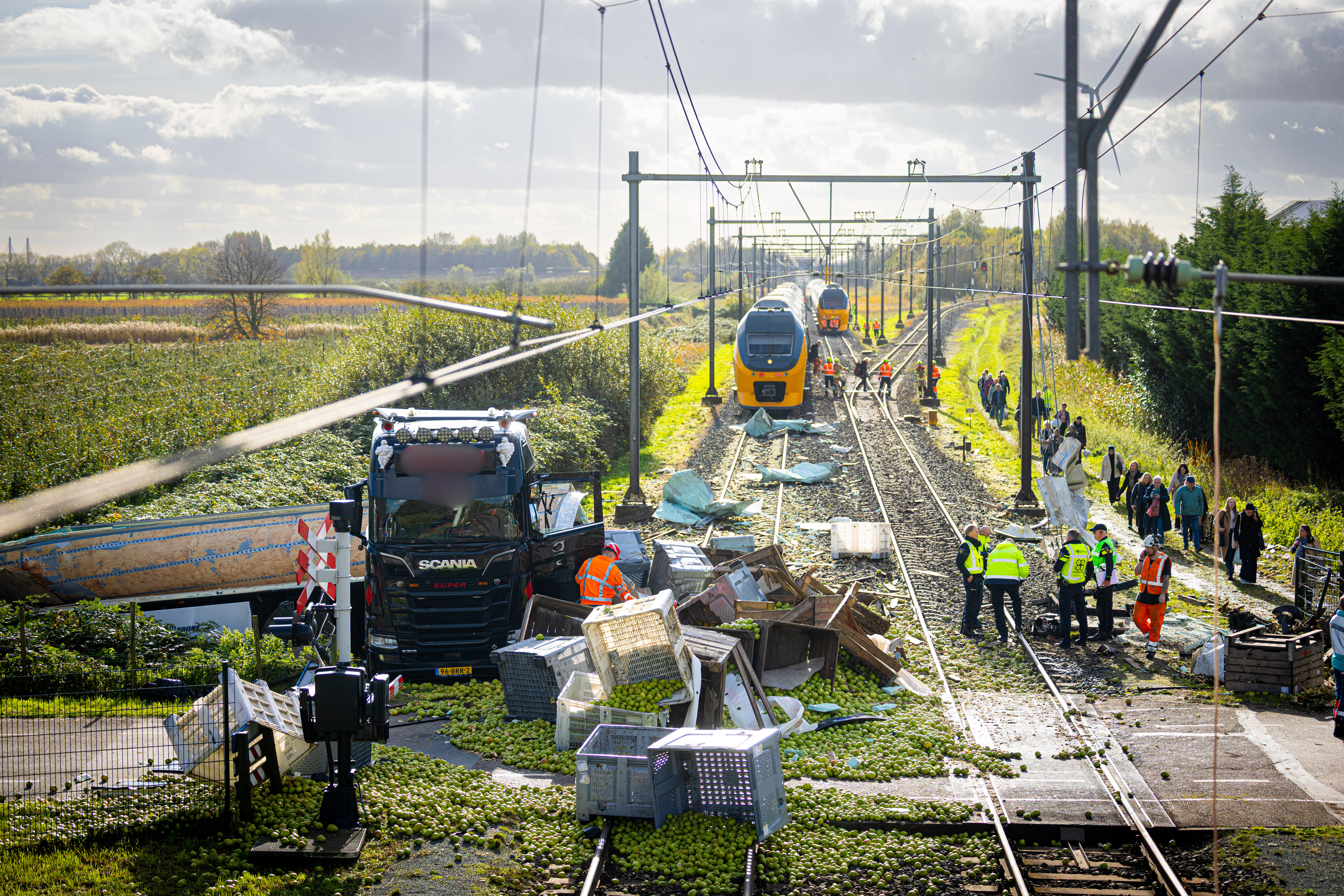Het fruit en een deel van de ravage is inmiddels opgeruimd. De trein die op de vrachtwagen reed is herspoord. Die wordt vandaag, net als de passerende trein die hem geschampt heeft, weggesleept. De schade aan het spoor is enorm. Na het opruimen kunnen we dat goed in kaart brengen en de voorbereidingen op de herstelwerkzaamheden starten. Die gaan meerdere dagen duren. Houd daarom je reisplanner goed in de gaten.