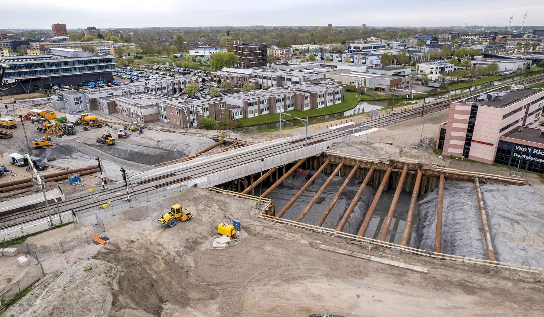 Een gat in de grond, meer lijkt het niet als je er naar kijkt. Maar dit gat reikt tot 10,5 meter onder. Dat punt is afgelopen week bereikt. Bob vertelt waarom je zo diep moet graven: “De bovenkant van het spoor ligt al 1 meter onder NAP. Het spoordek is 2 meter dik, de doorrijhoogte van de spooronderdoorgang 4,5 meter. Dan is er nog de betonnen vloer van de onderdoorgang, die is ook een meter dik. En daaronder nog de waterberging waarin we 450 m3 regenwater kunnen opvangen. Die is ook twee meter hoog. Dan kom je, alles bij elkaar opgeteld op 10,5 meter onder NAP uit.”