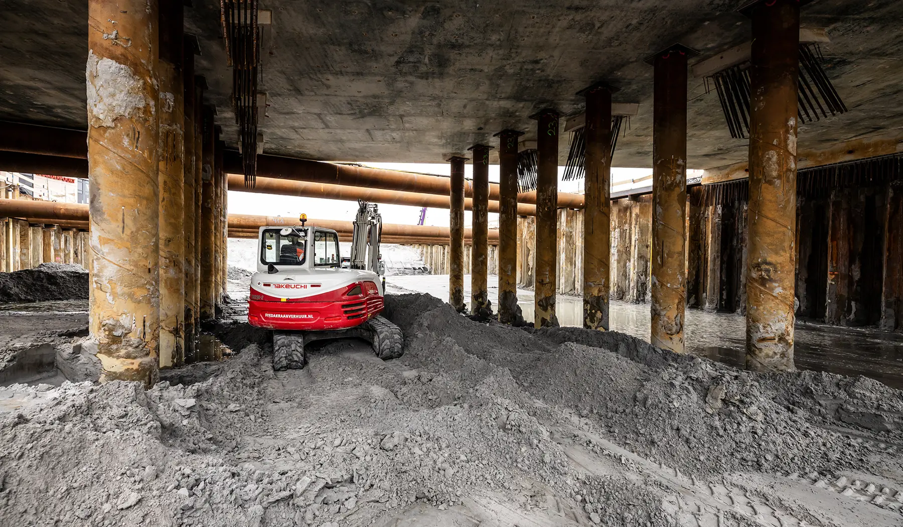 Het droog houden van de bouwkuip is een grote uitdaging als je tot 10,5 meter onder NAP graaft. Daarom zijn er maatregelen genomen om waterfonteinen te voorkomen. Bob: “We gebruiken meerdere pompen, die kunnen elkaars werk overnemen op het moment waarop er één uitvalt. Ook kan de stroom uitvallen. Daarvoor hebben we een alternatief zodat de pompen kunnen blijven draaien. De pompen moeten altijd blijven draaien. Maar er zijn nog meer scenario’s waar we rekening mee hebben gehouden. Bijvoorbeeld als één van de stempels loslaat. We hebben daarom extra stempels geplaatst, zodat de constructie de druk alsnog aankan. Dit is maar één van de vele voorbeelden, we zijn dus goed voorbereid.”