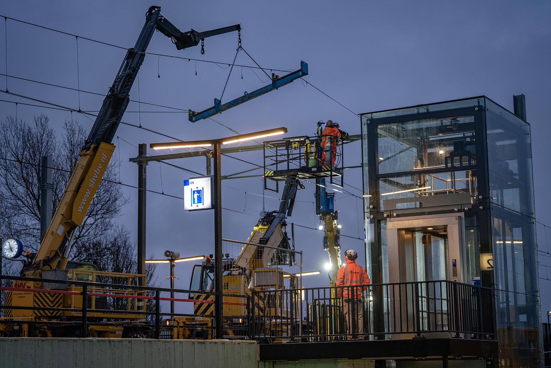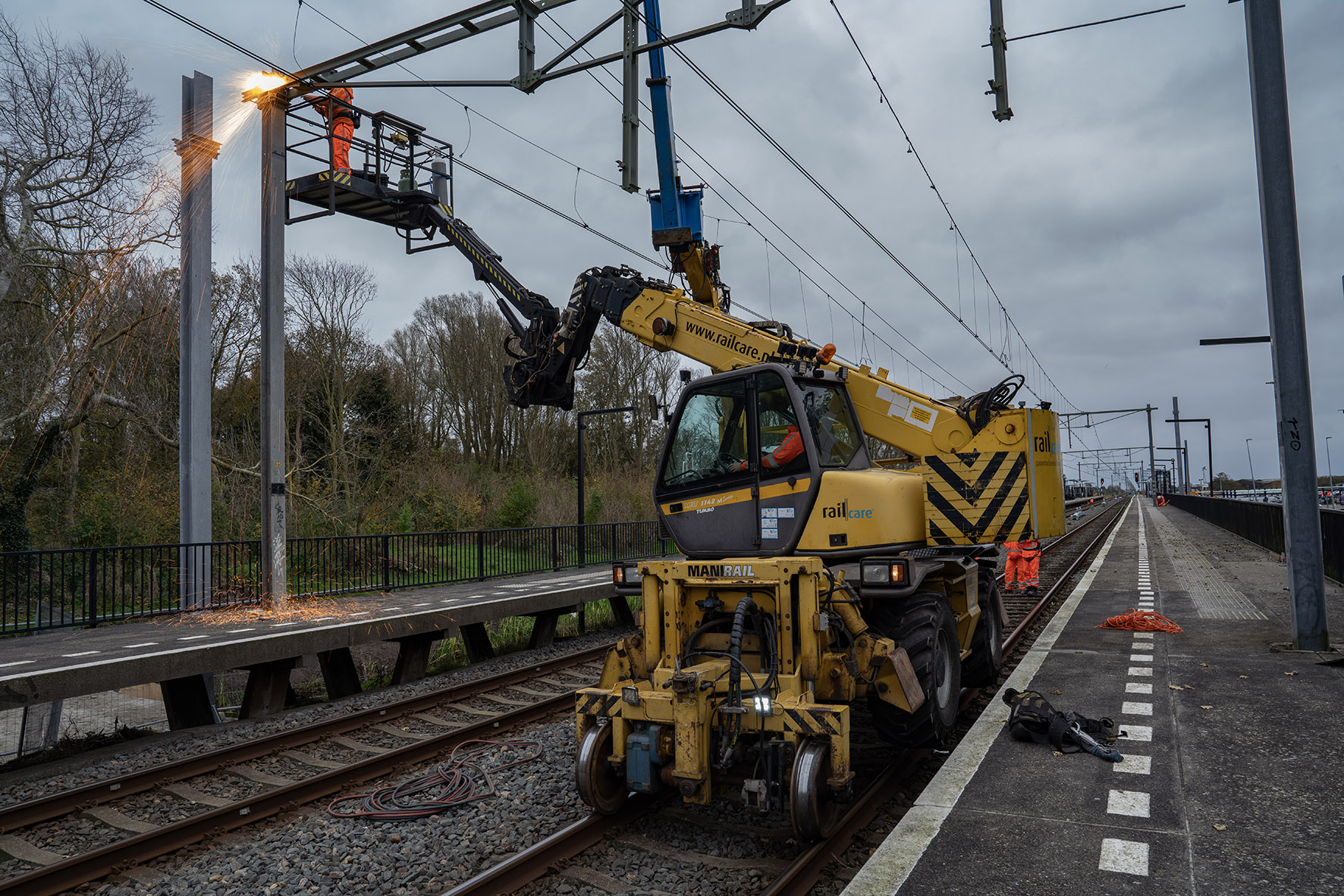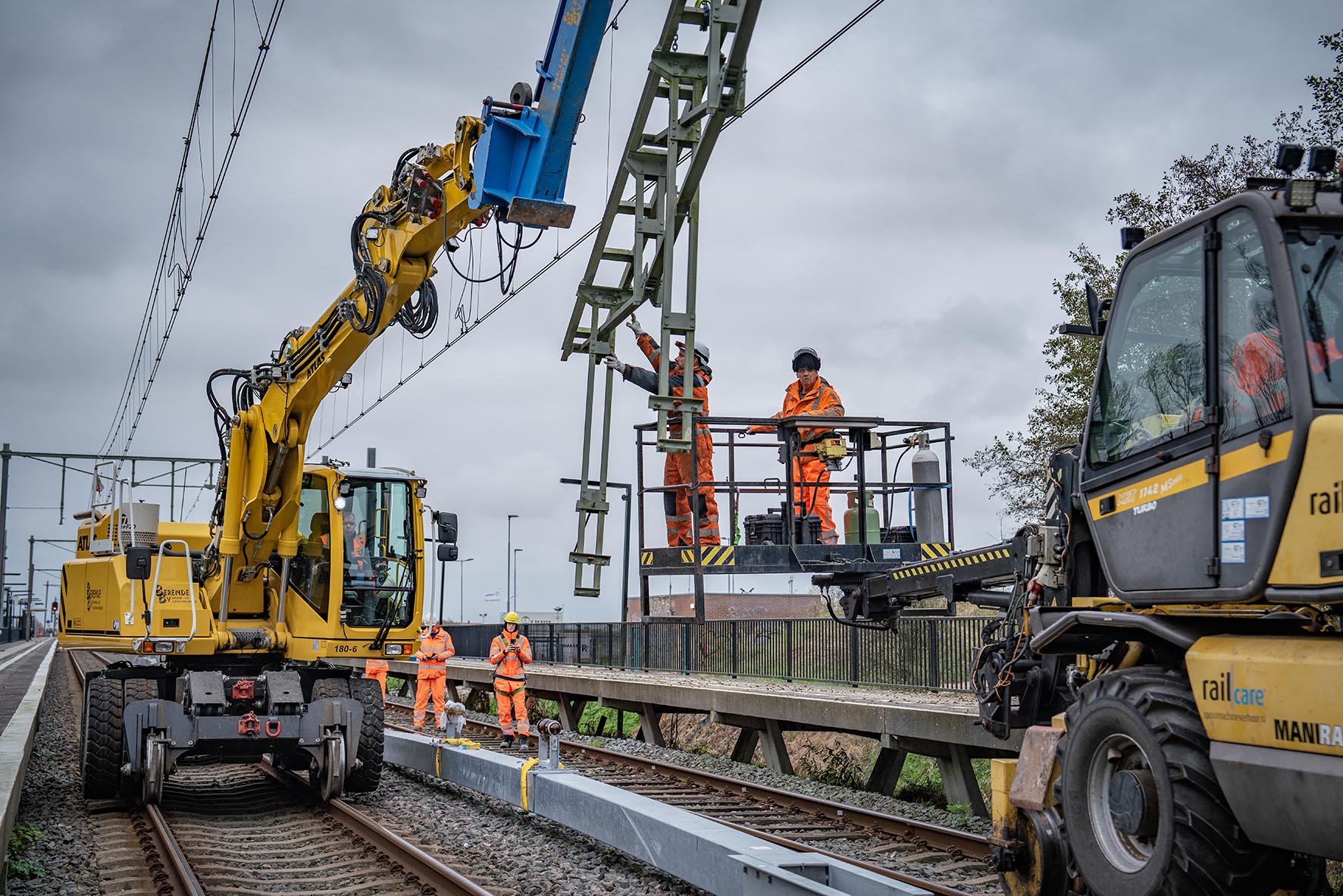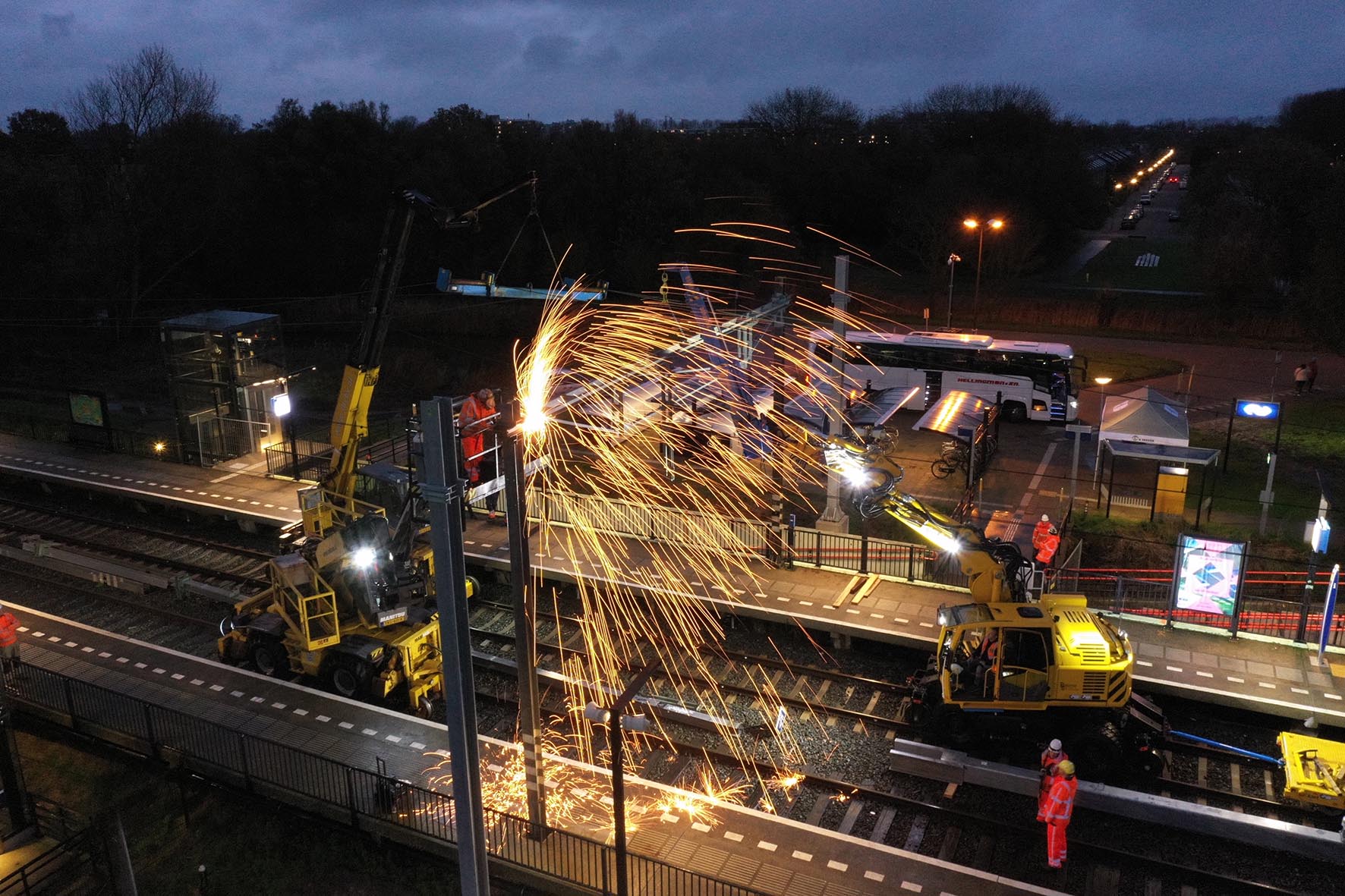 Het werkweekend in oktober stond in het teken van boringen, vertelt John. “We hebben met een grote boor- en heimachine gaten geboord voor de fundering van nieuwe bovenleidingsportalen (de constructie waar de bovenleiding aan hangt). Die schachten zijn volgestort met beton. Het afgelopen weekend hebben we vier oude portalen) vervangen voor nieuwe. Daarvoor hebben we hijskranen gebruikt. Door de portalen ets te verplaatsen hebben we meer ruimte voor perrons.” De komende maanden is het weer wat rustiger rond het station, maar we zitten niet stil.