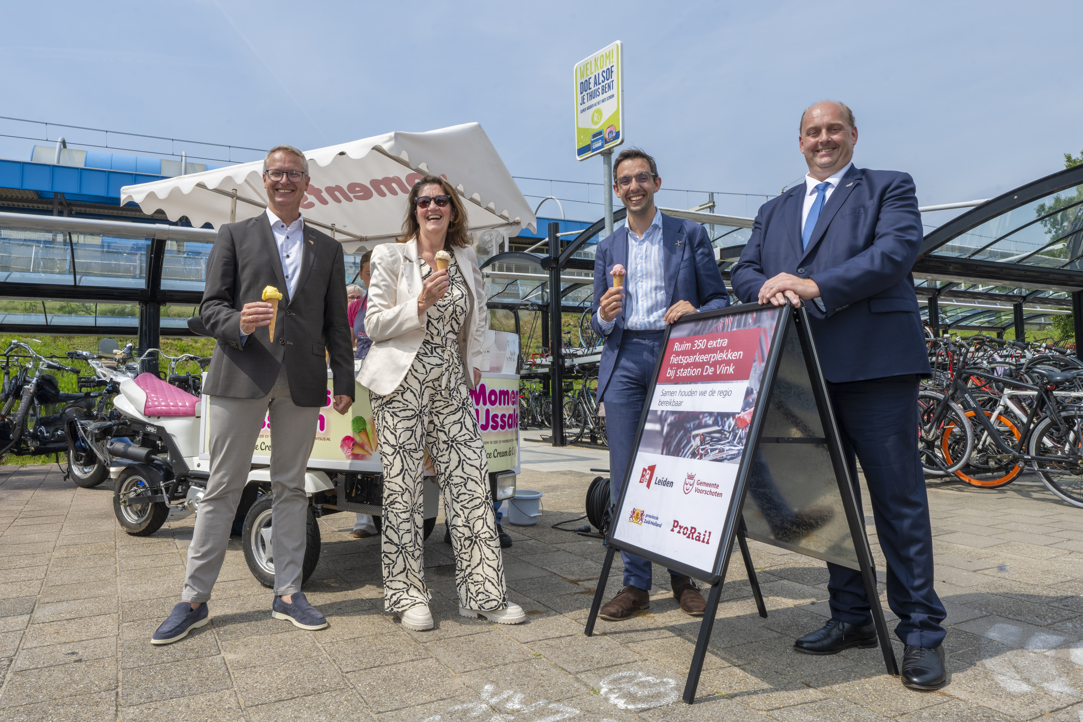 Vandaag werd de oplevering van de fietsenstalling feestelijk gevierd. Dat deed ProRail met de wethouders van de gemeentes Leiden en Voorschoten en de gedeputeerde van de provincie Zuid-Holland. Samen onderstreepten zij het belang van goede fietsvoorzieningen als onderdeel van een toekomstbestendig openbaar vervoer. De reiziger werd tijdens deze warme dag op station De Vink getrakteerd op een heerlijk ijsje.
