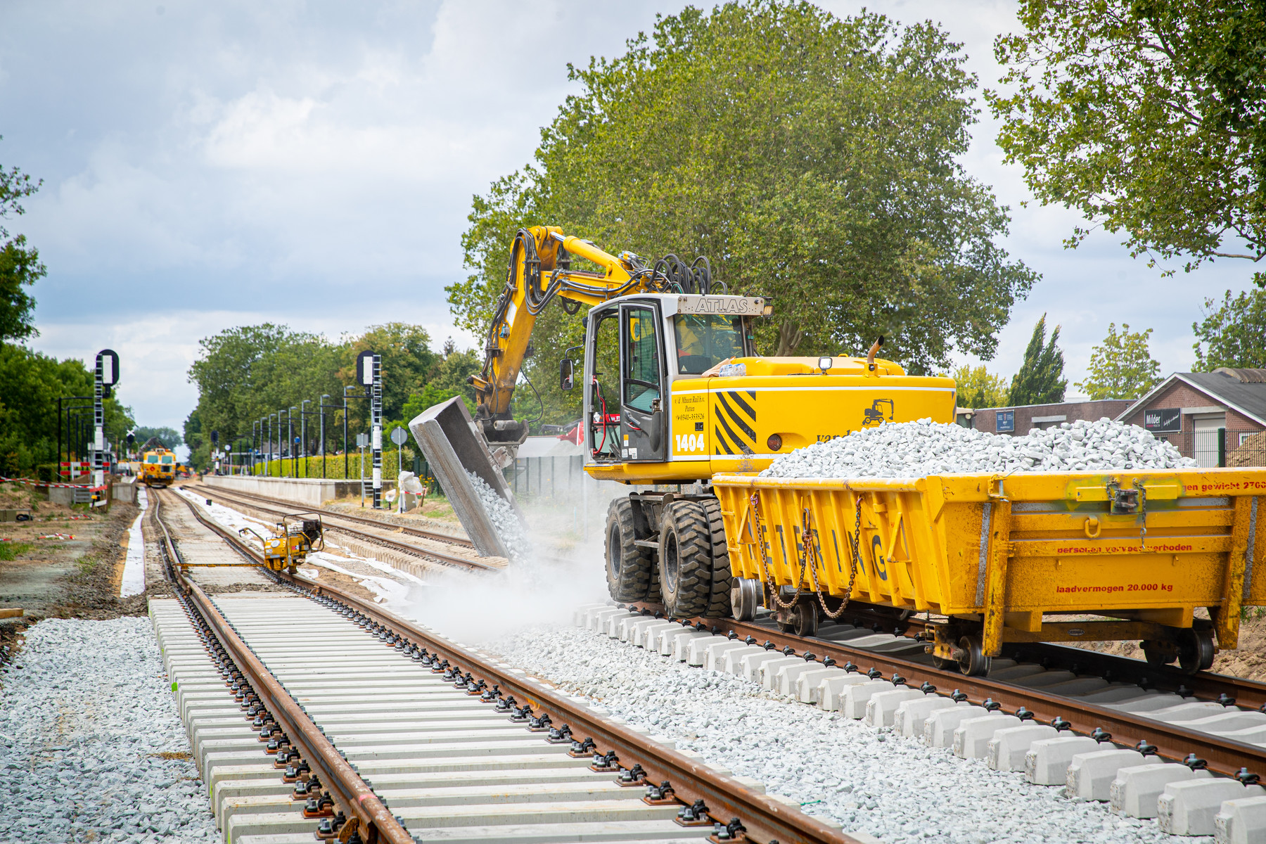 Bij het station in Didam heeft de aannemer inmiddels een nieuw wissel gebouwd. Een zogenaamde ‘kettinghor’ vernieuwt het ballastgrind tussen de sporen van Zevenaar naar Didam. Over het gehele spoortraject legt de aannemer 23 kilometer nieuwe rails, ruim 19.000 nieuwe dwarsliggers en verwerkt hij 80.000 ton oude en nieuwe ballastgrind. Aankomende dagen maakt de aannemer alle bestaande overwegen dubbelsporig, sluit hij de nieuwe seinen aan en worden nieuwe sporen aan elkaar gelast met zogenaamde ‘thermietlassen’. Hierna volgen uitgebreide veiligheidstesten met een speciale testtrein. Vanaf maandag 12 augustus rijden de treinen over het geheel vernieuwde spoor.