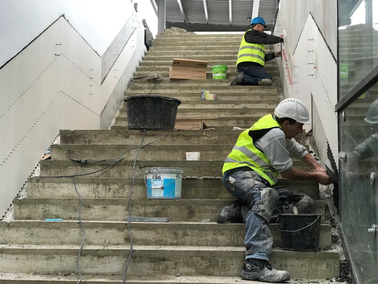 Tegelzetters aan het werk langs de opgaande perrontrappen.