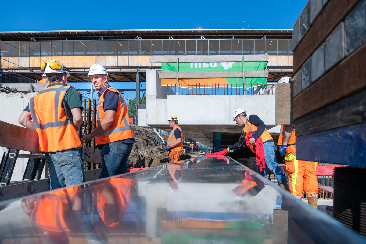 Het dek ligt nu op 2 millimeter nauwkeurig op zijn plaats. Aanstaande dinsdag 23 juli laten we het spoordek zakken, zodat het volledig rust op de betonnen pijlers. Daarna wordt de blauwe draagconstructie volledig afgebroken. Nog dit jaar worden op het tweede ingeschoven dek twee gloednieuwe sporen aangelegd. Tussen de spoordekken komt een constructie waar het middenperron op verschijnt. Fietsers en voetgangers lopen en fietsen straks onder het nieuwe perron door.