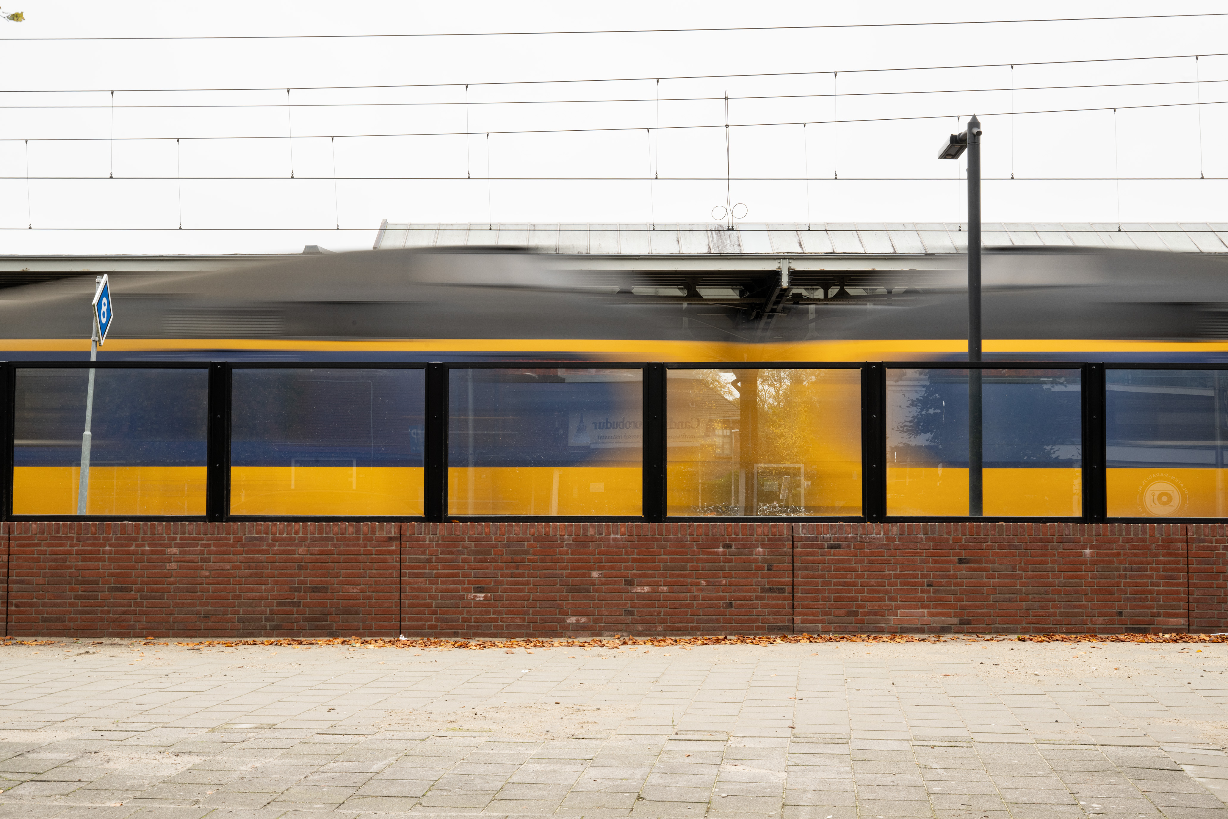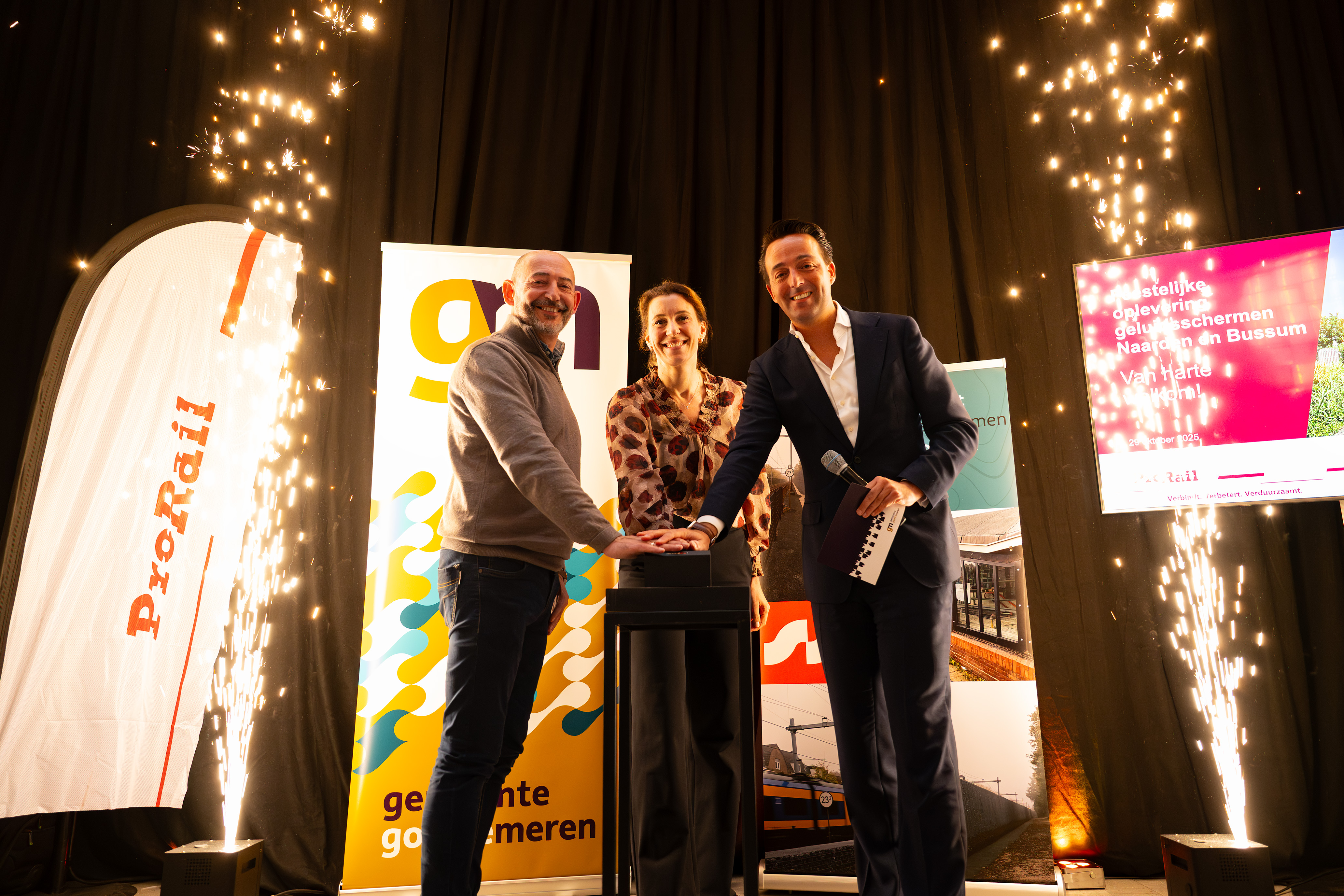 Danou Veenhof, regiodirecteur Randstad Noord a.i. van ProRail, vierde de oplevering mee. “Op veel plaatsen in Nederland bouwen we geluidsschermen of nemen we andere maatregelen om hinder voor omwonenden te beperken. Hier is dat op verschillende plekken gedaan, waarbij goed gekeken is naar de omgeving en welke materialen passend zijn voor de locatie. Dat zie je langs het traject, maar ook hier op het station Naarden-Bussum. We zijn hier met veel aandacht voor het historische stationsgebouw, samen met bureau Spoorbouwmeester en welstandscommissie van de gemeente Gooische Meren, tot glazen schermen gekomen.”