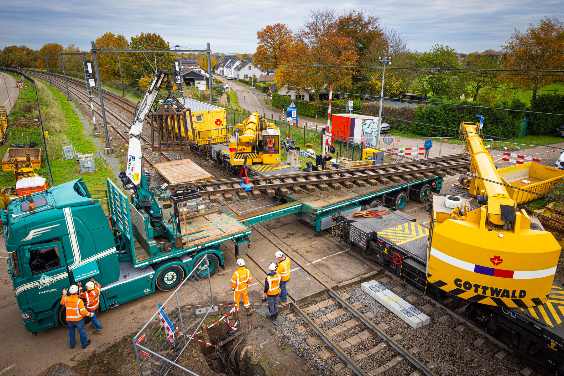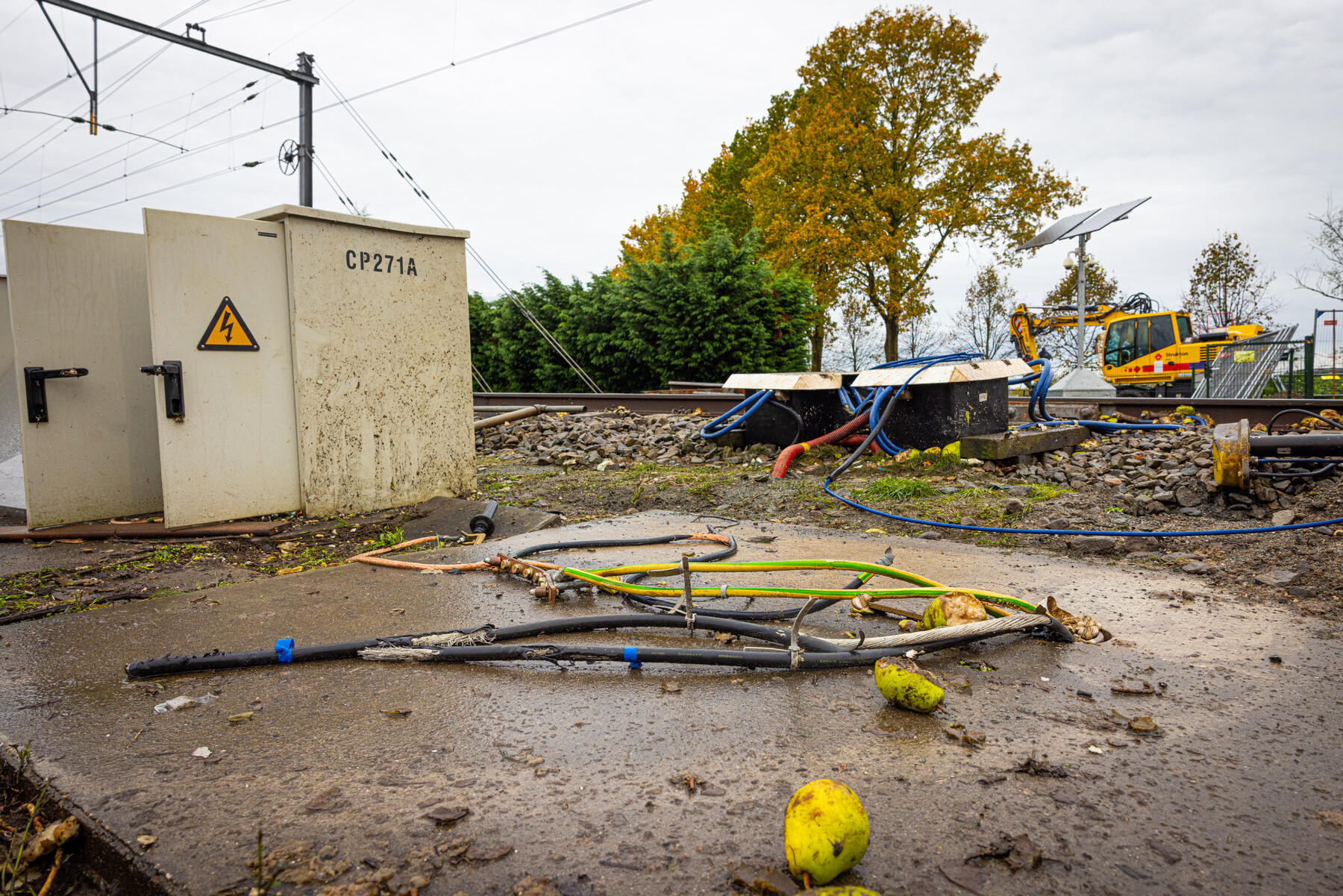 Op de locatie in Meteren is een speciale weg en verlichting aangelegd, zodat de aannemer 24/7 kan werken. Uit onderzoek blijkt dat de bovenleiding en de ondergrondse kabels intact zijn gebleven. Die hoeven we niet te vervangen.