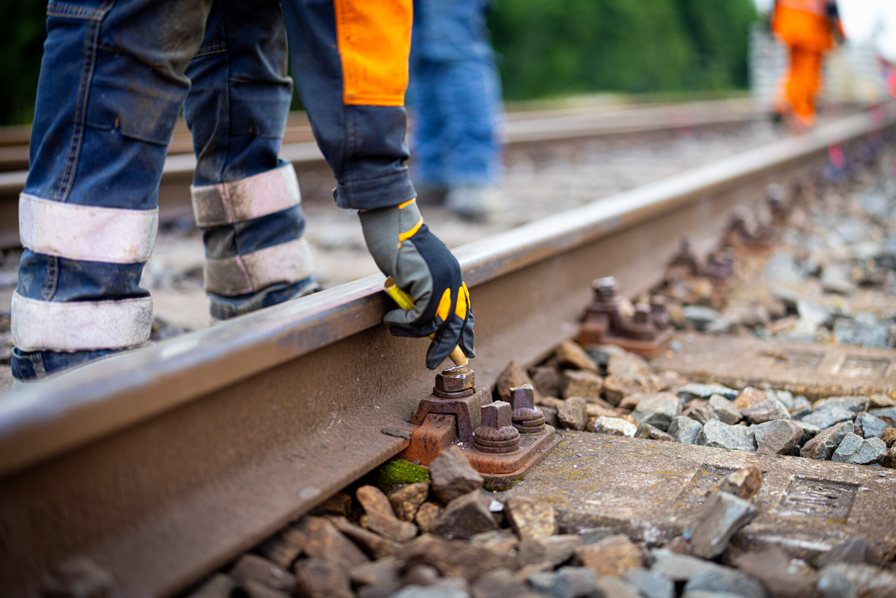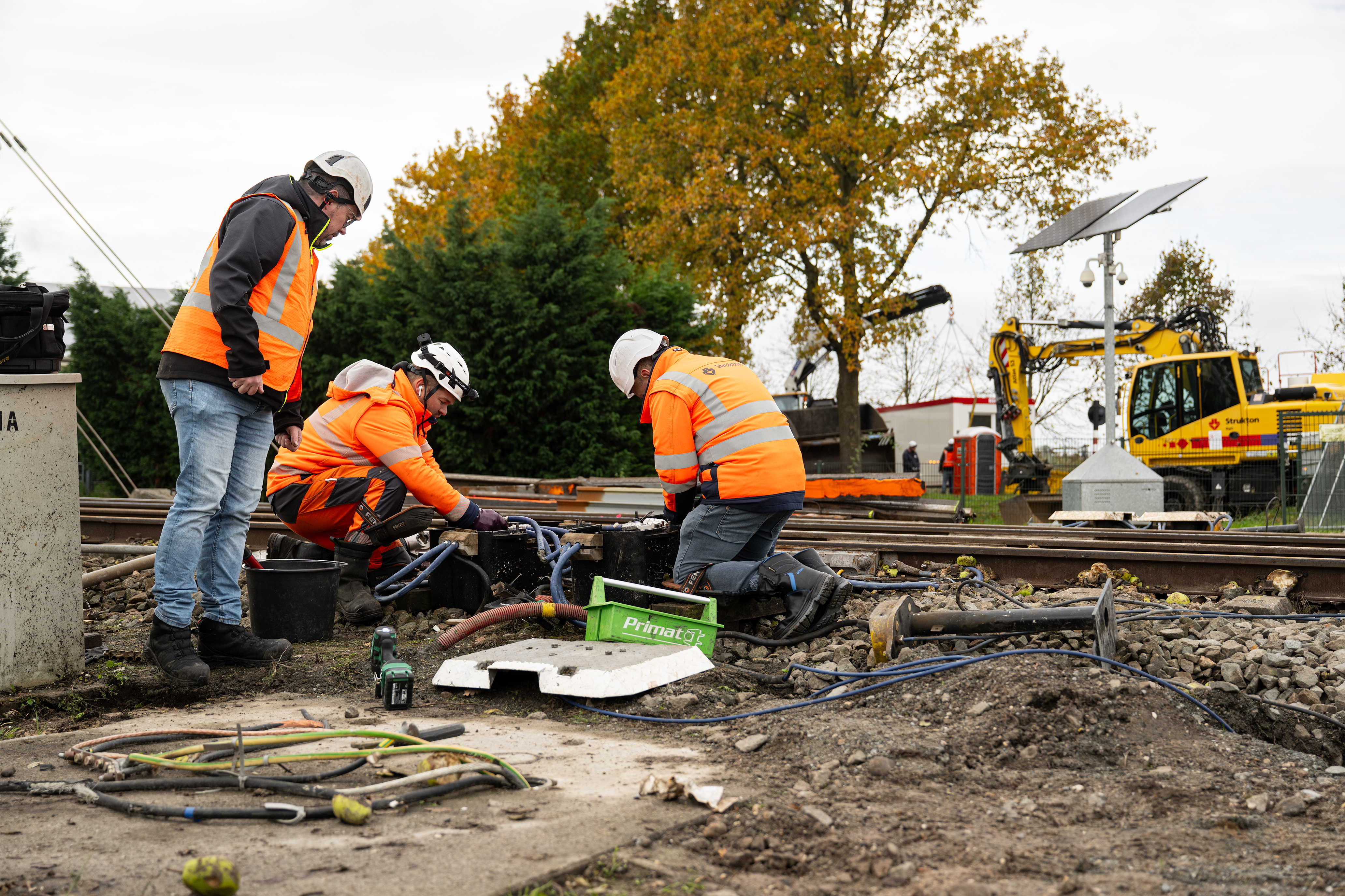 Het vervangen van de spoorstaven moet heel precies gebeuren. Eerst wordt de gleuf waarin de spoorstaaf komt te liggen helemaal schoongemaakt. Vervolgens is het belangrijk dat de spoorstaaf kaasrecht ligt. En tot slot gieten we de spoorstaaf met rubber in. Als dat allemaal is gedaan, moet het rubber acht uur lang uitharden.