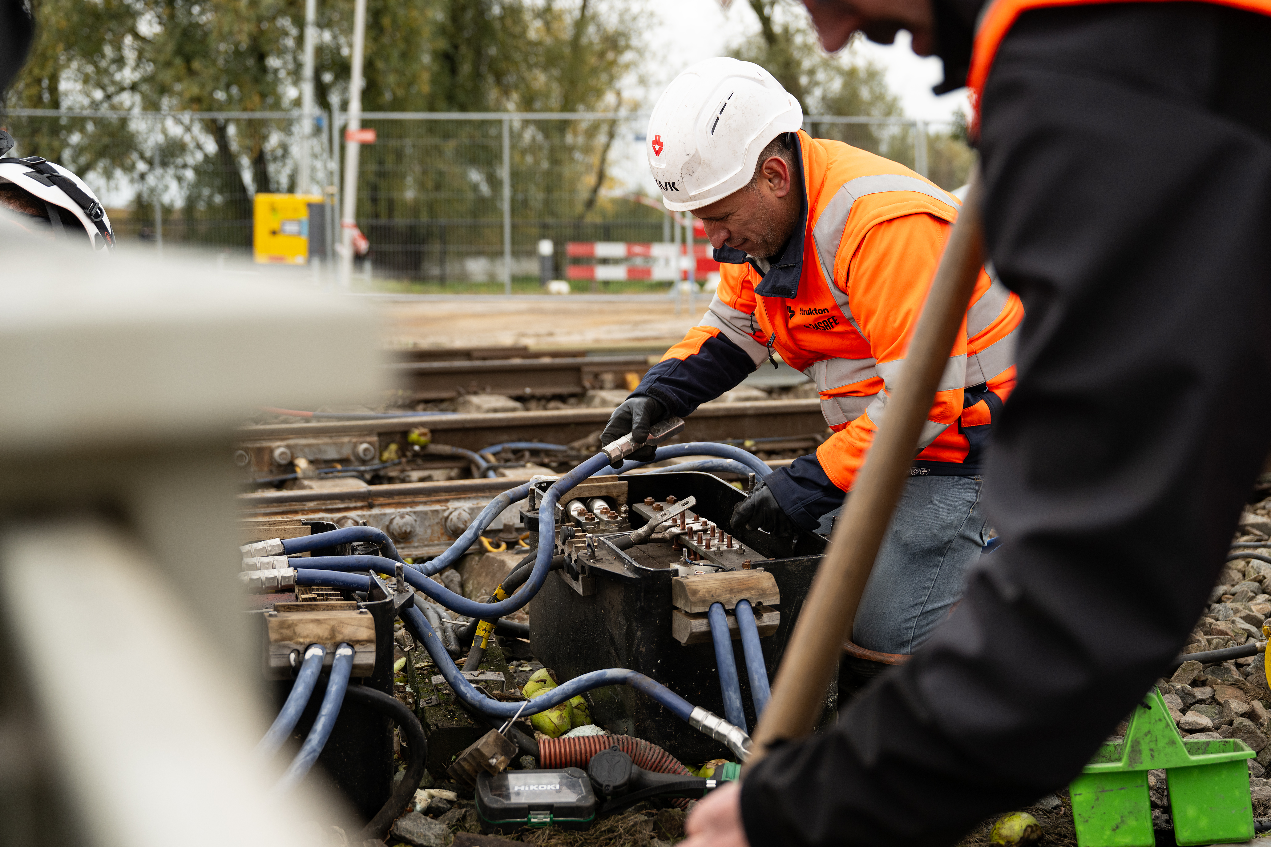 Samen met aannemer Strukton zijn we vandaag aan de slag gegaan met het verwijderen van het stukgereden wissel en de kapotte spoordelen. Daarnaast zijn we druk bezig met het egaliseren van de grond. Dat is nodig om vanavond het nieuwe wissel te kunnen plaatsen. Ook liggen er nieuwe dwarsliggers klaar.