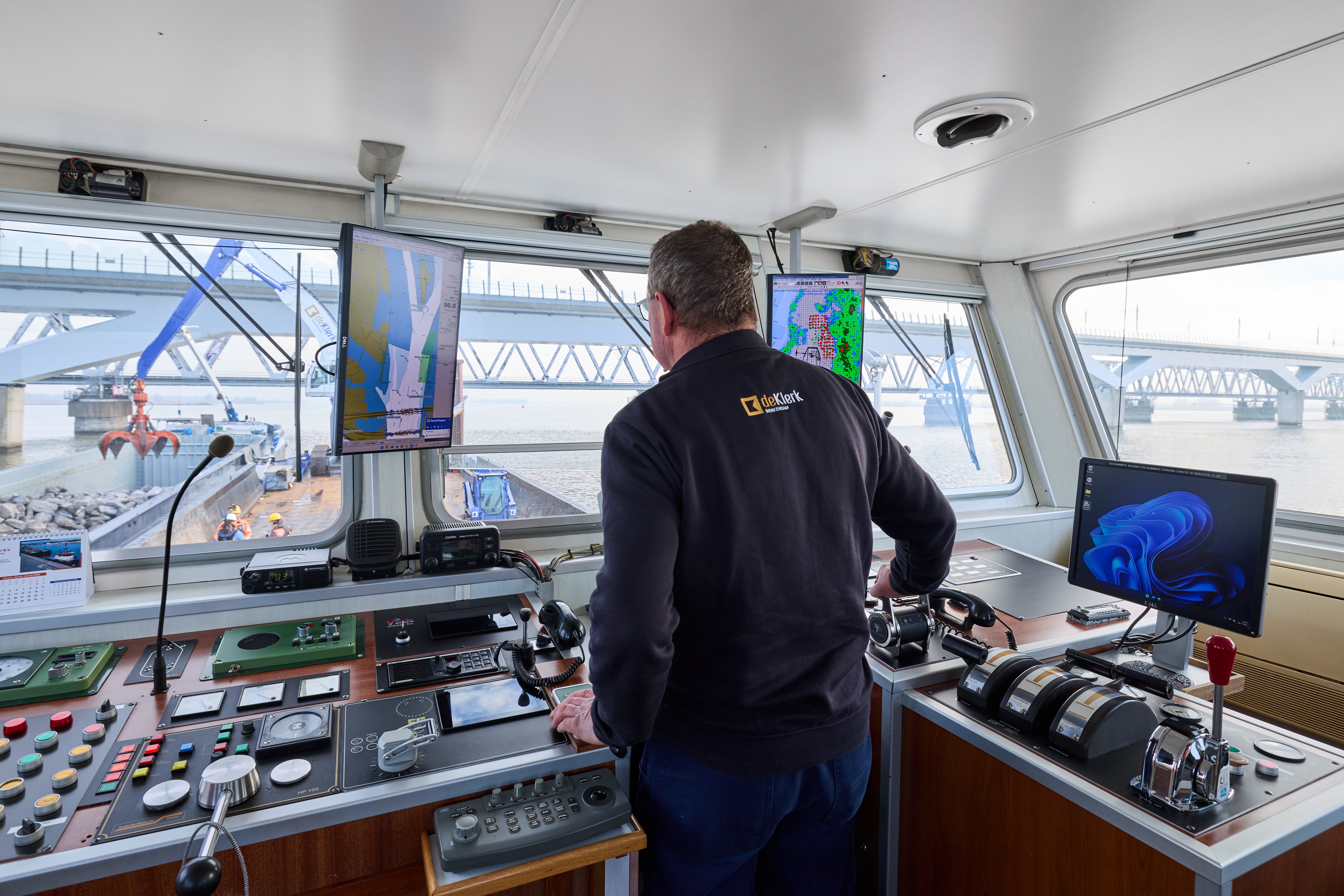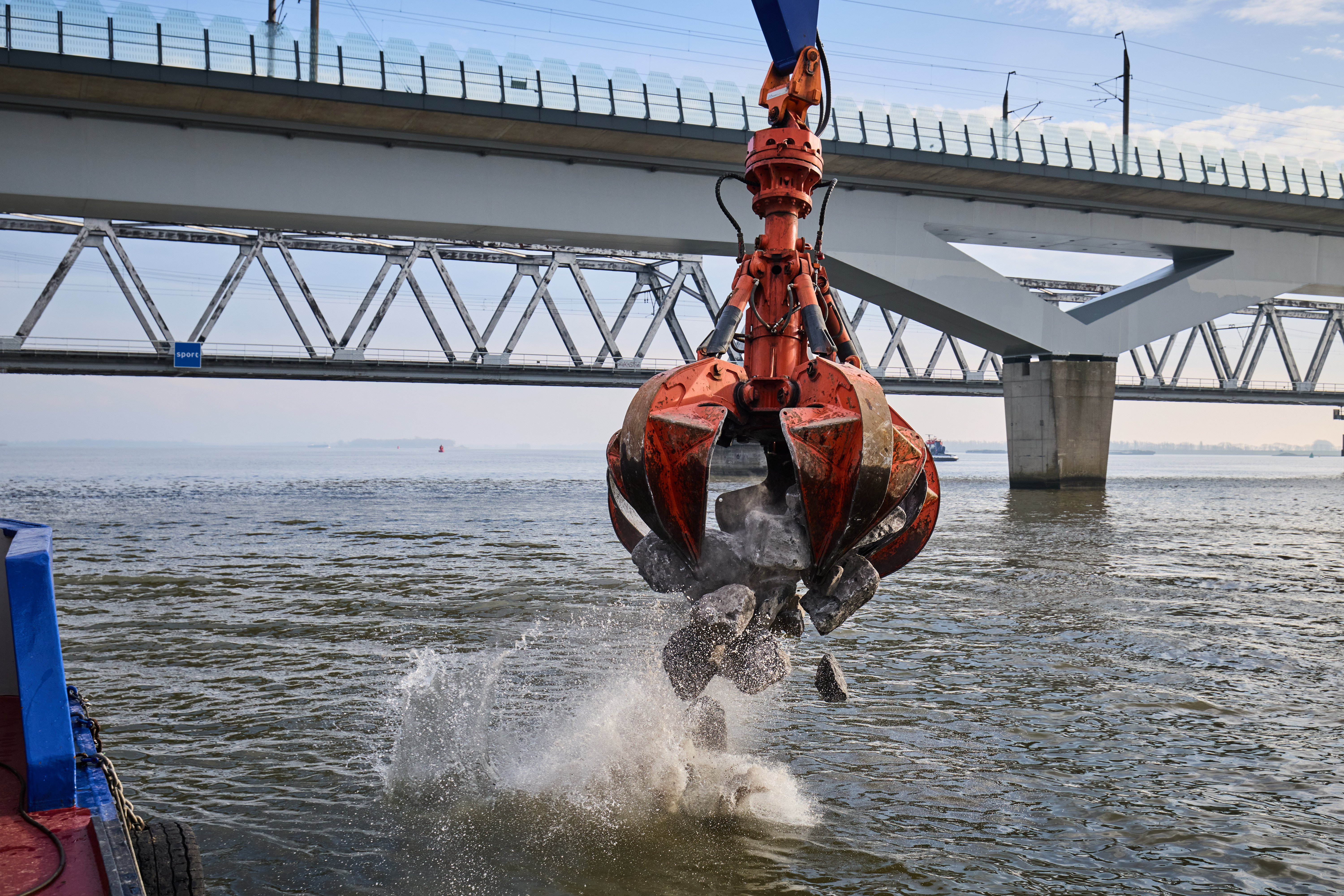 Boedi: “Door de natuurlijke stroming van het Hollandsch Diep zijn rondom de pijlers van de brug erosiekuilen ontstaan. Eb en vloed, een sterke stroming en extra water door regen- en smeltwater zorgen ervoor dat zand verplaatst. Aan de westkant van de brug zijn daardoor vijf kuilen ontstaan. Het zijn enorme kuilden, de grootste 135 meter lang, 40 meter breed en 12 meter diep.” Thijmen vult aan: “Wij vullen de kuilen met fijne fractie steen en dekken die af met in totaal 110.000 ton stenen. Daarmee voorkomen we dat de bodem verder uitslijt en beschermen we de fundering van de brug.”