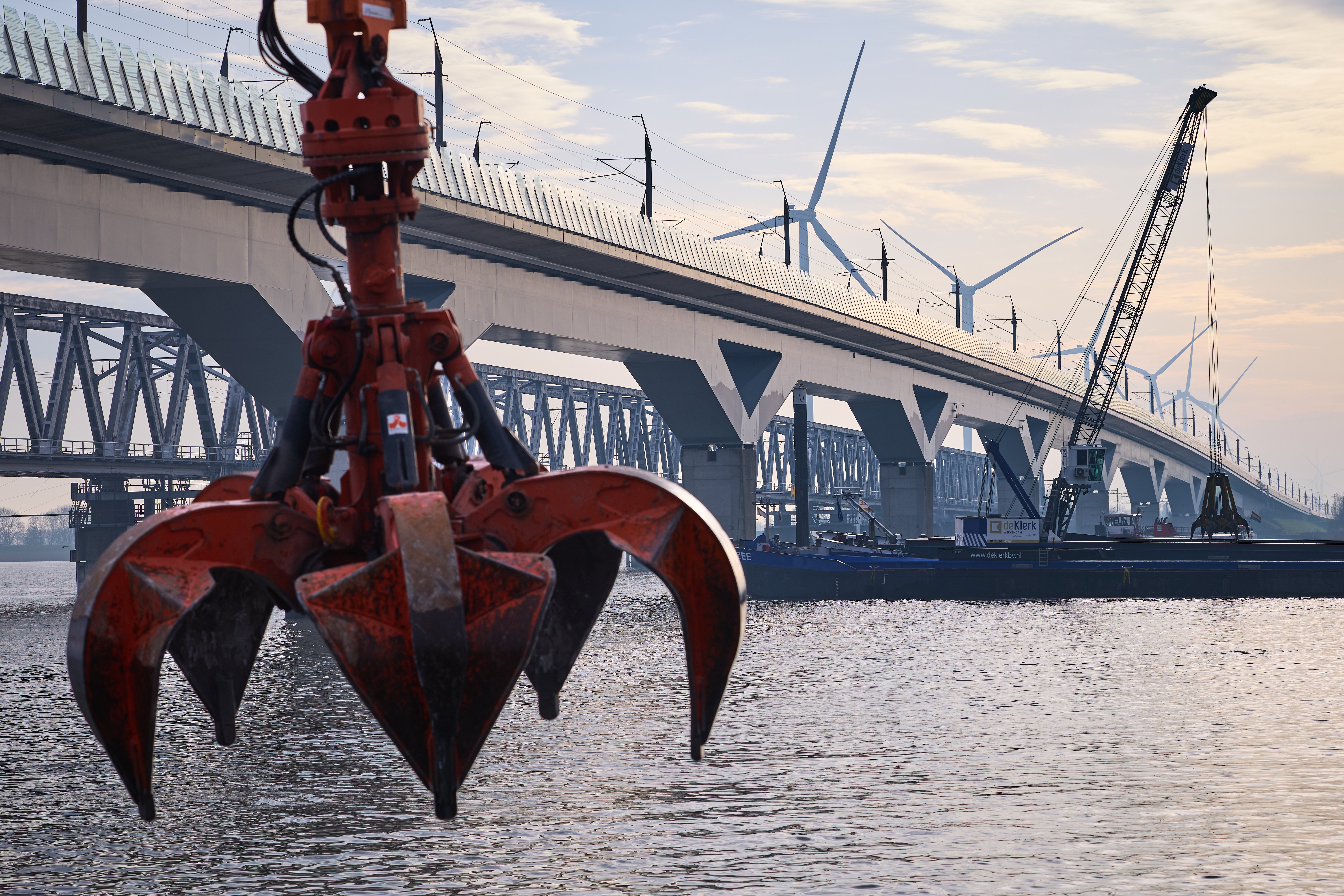 De herstelwerkzaamheden onder water bij de HSL-brug over het Hollandsch Diep zijn op de helft. Sinds begin november werken we aan het versterken van de bodem rond de brugpijlers tussen Dordrecht en Moerdijk. Zo zorgen we ervoor dat de brug veilig blijft en het (inter)nationale treinverkeer kan blijven rijden.