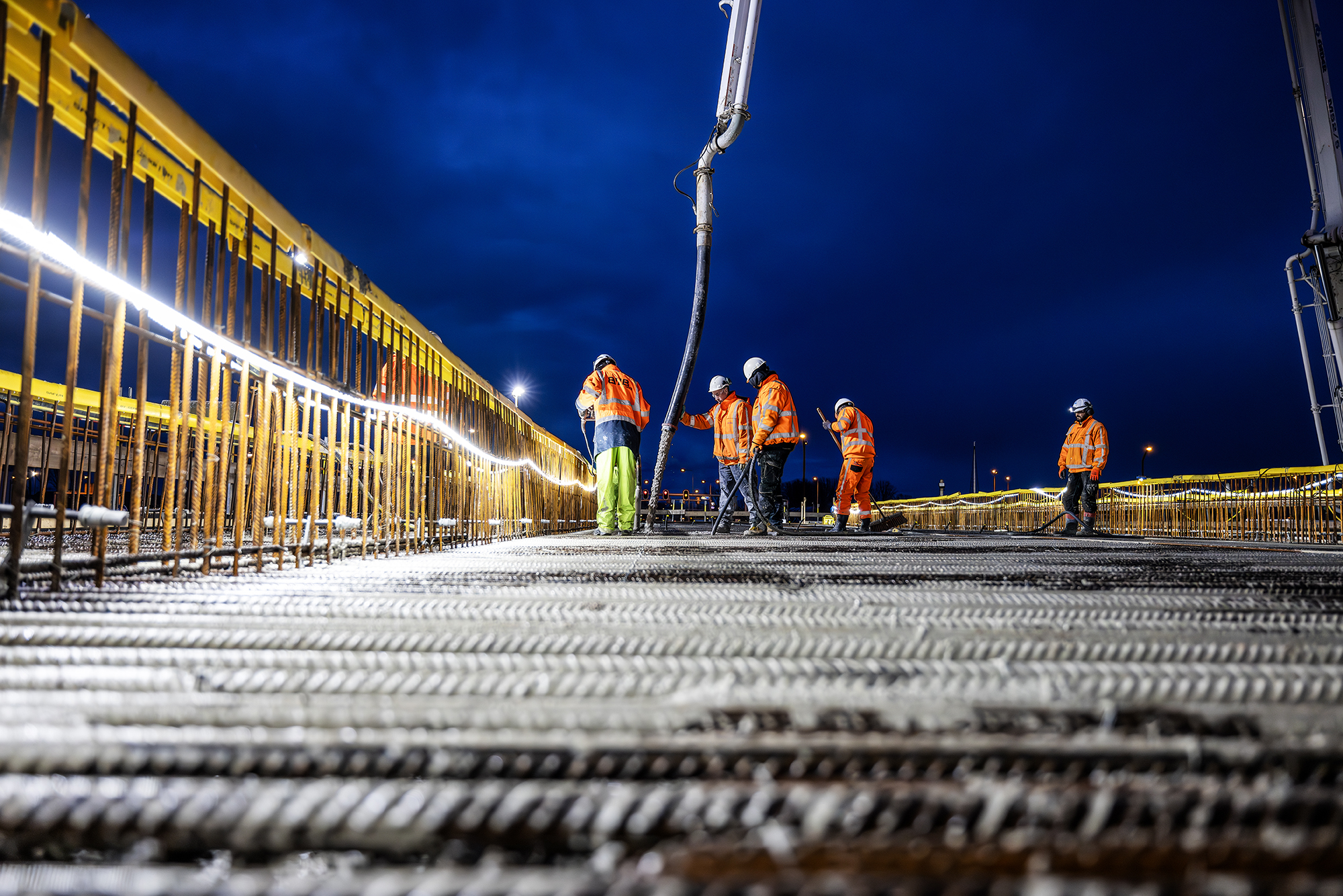 Aannemerscombinatie Mobilis-Hegeman heeft op 4 december het beton gestort voor het spoordek van de onderdoorgang Zuidtangent bij Heerhugowaard. Ruim 430 kubieke meter beton werd die avond verwerkt. “Een prima getimede logistieke operatie waarbij het droge weer goed heeft geholpen,” vertelt Marcel Martens, bouwmanager van ProRail.