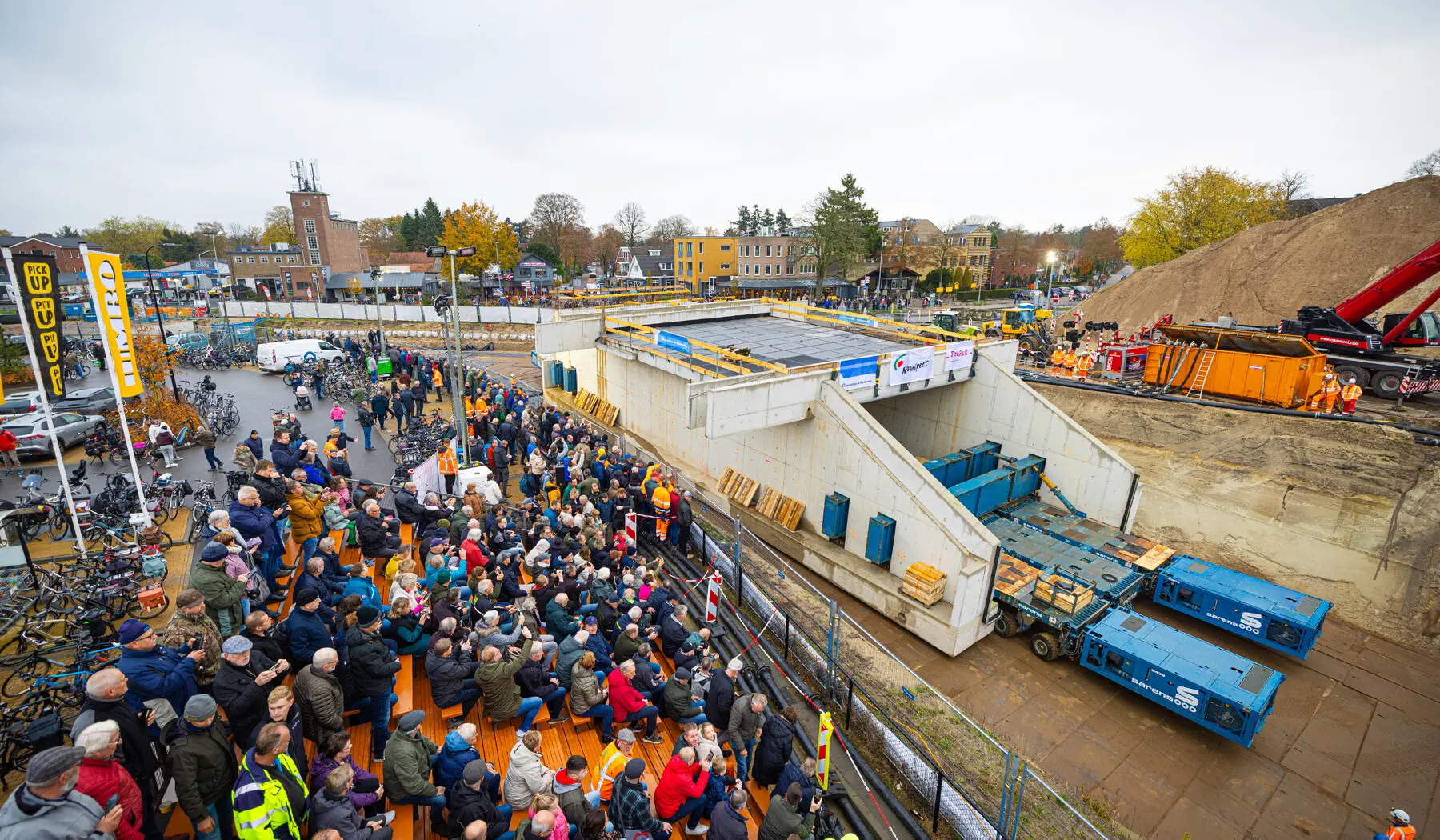 Het is gelukt. De drie tunnelbakken in Nunspeet liggen op de juiste plek. In 100 uur hebben de mannen van vrouwen van aannemer Van Hattum en Blankevoort alles op alles gezet om de klus te klaren. Dat allemaal onder het toeziende oog van honderden nieuwsgierige Nunspeters die vanaf de tribune een kijkje kwamen nemen.