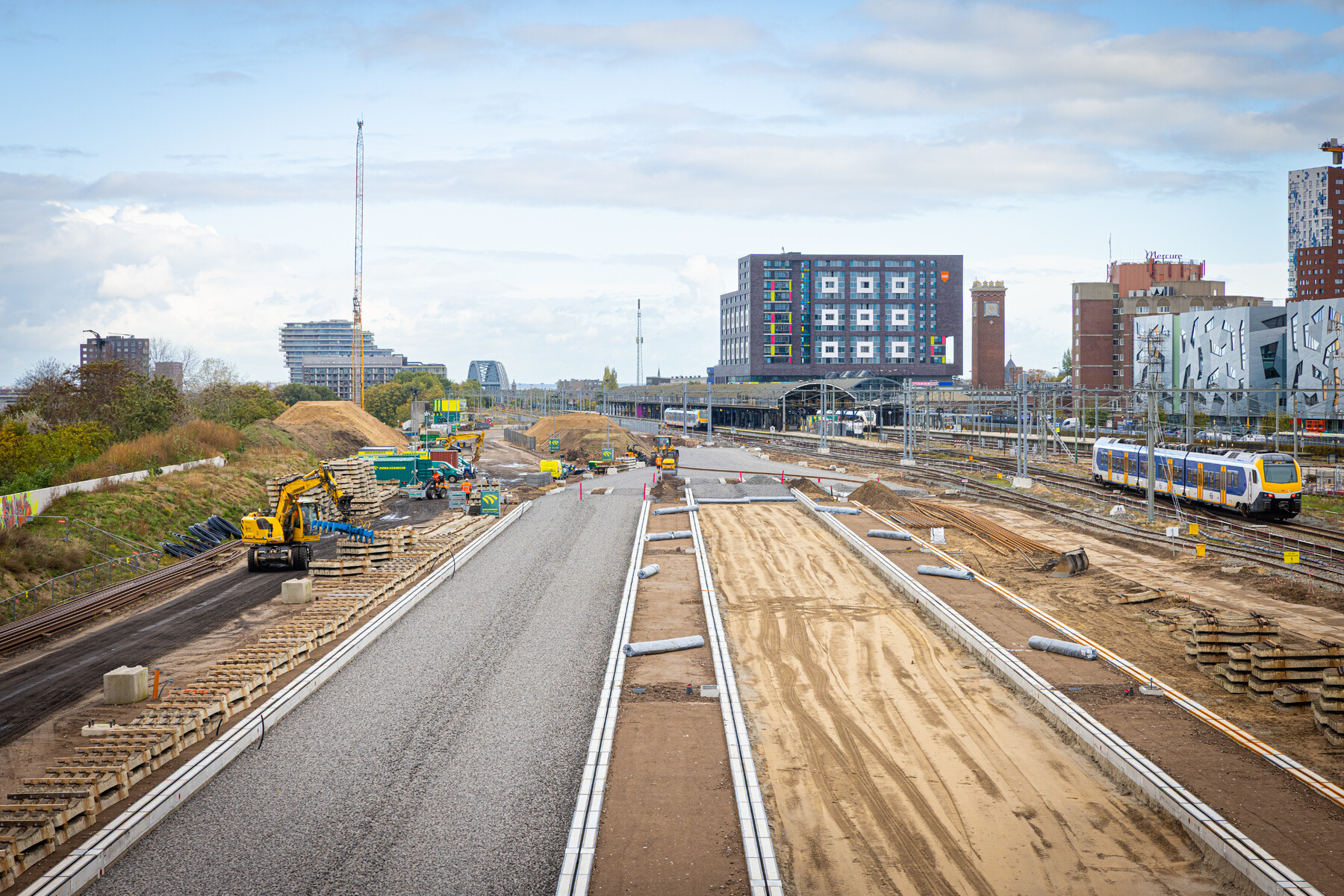 Het opstelterrein krijgt steeds meer vorm. Het ballastbed, de onderlaag van het spoor, ligt er al voor een groot deel. De dwarsliggers, spoorstaven worden eind dit jaar gelegd. De bovenleiding en spoorbeveiliging volgen later. Naar verwachting is het opstelterrein eind mei 2026 klaar voor gebruik.