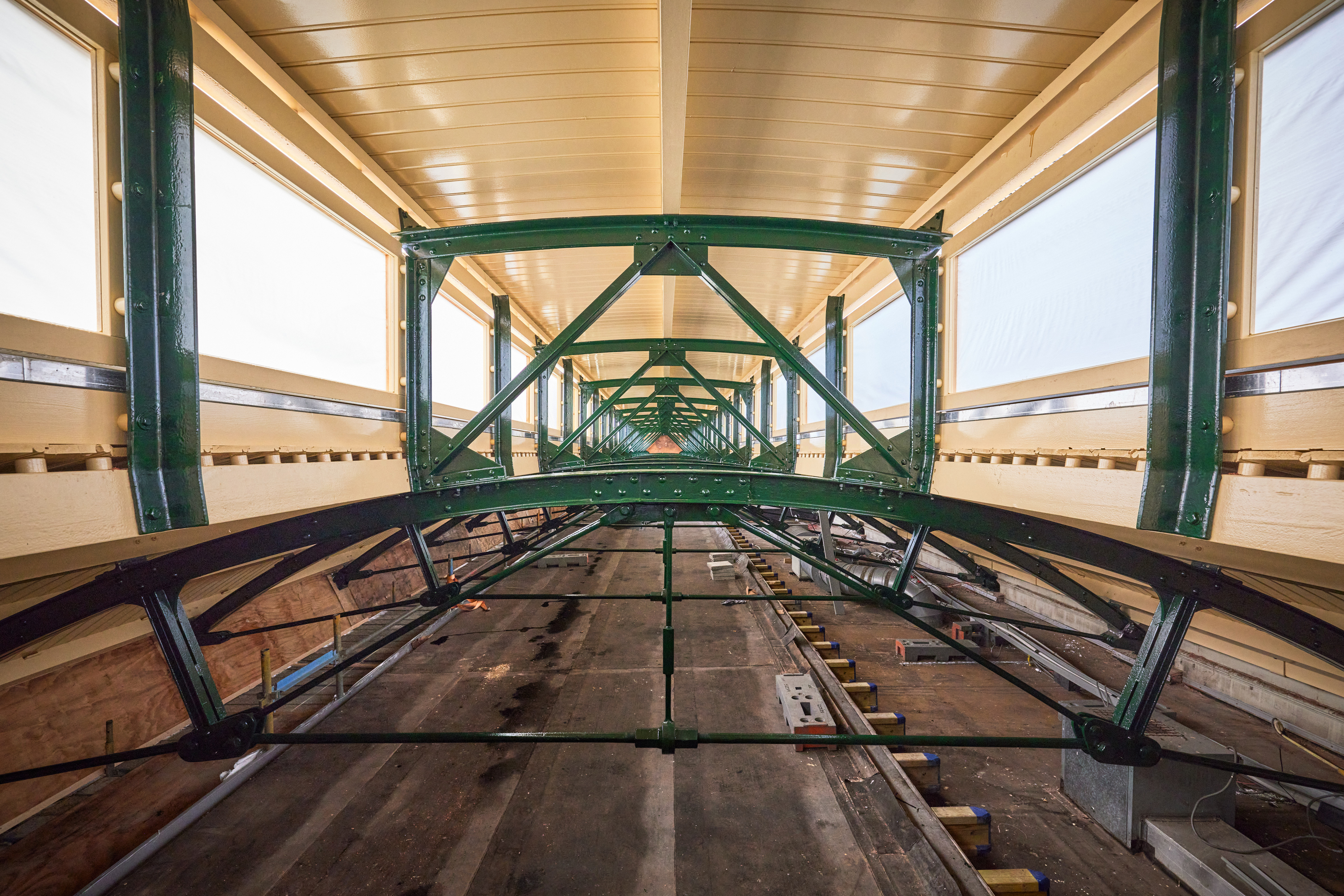 Na eerder onderzoek bleek dat de originele kleur van de houten elementen licht okergeel is geweest. Deze kleur zie je opnieuw terug in het dakbeschot. De staalconstructie schilderen we in de originele dennengroene kleur.