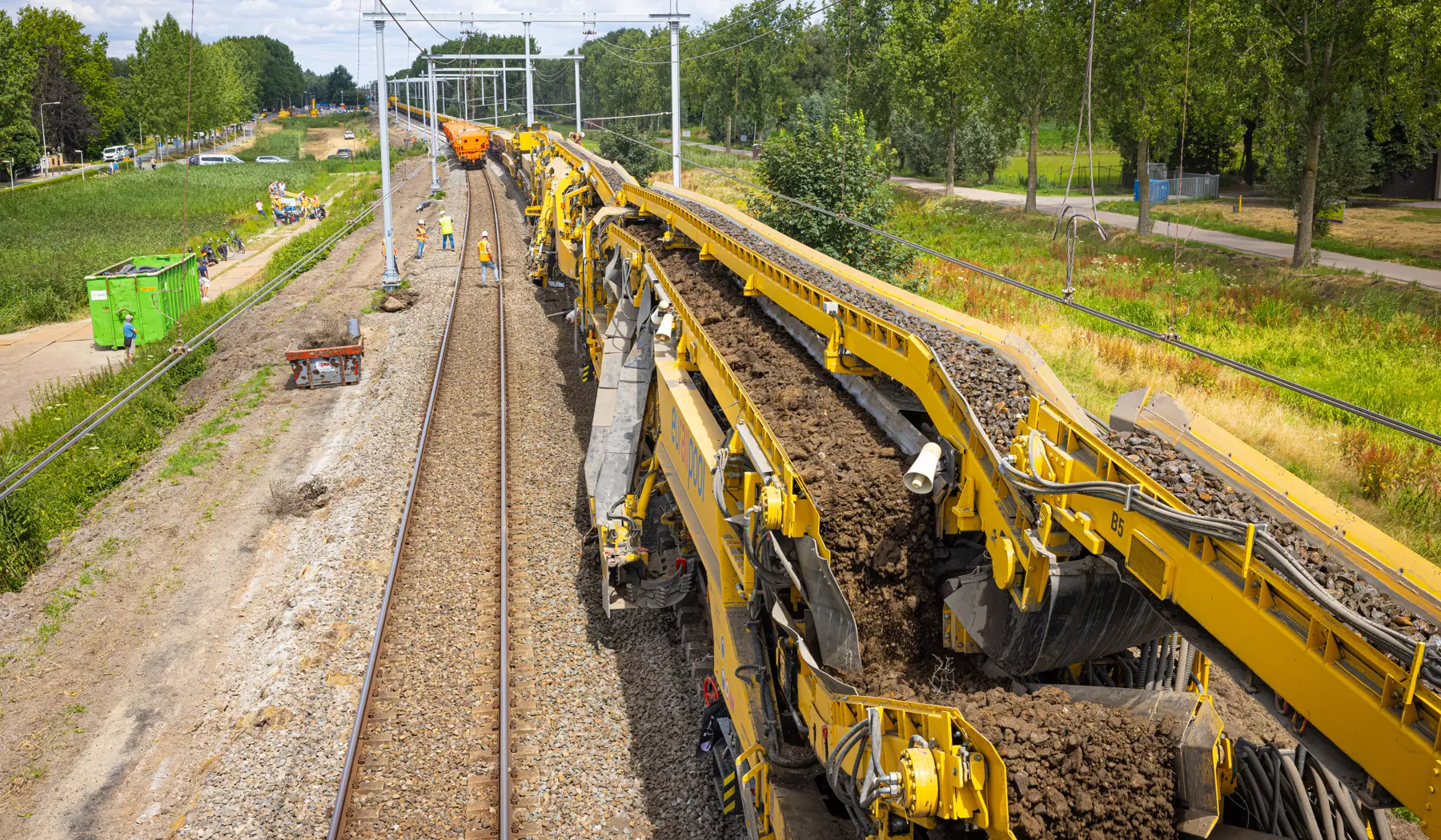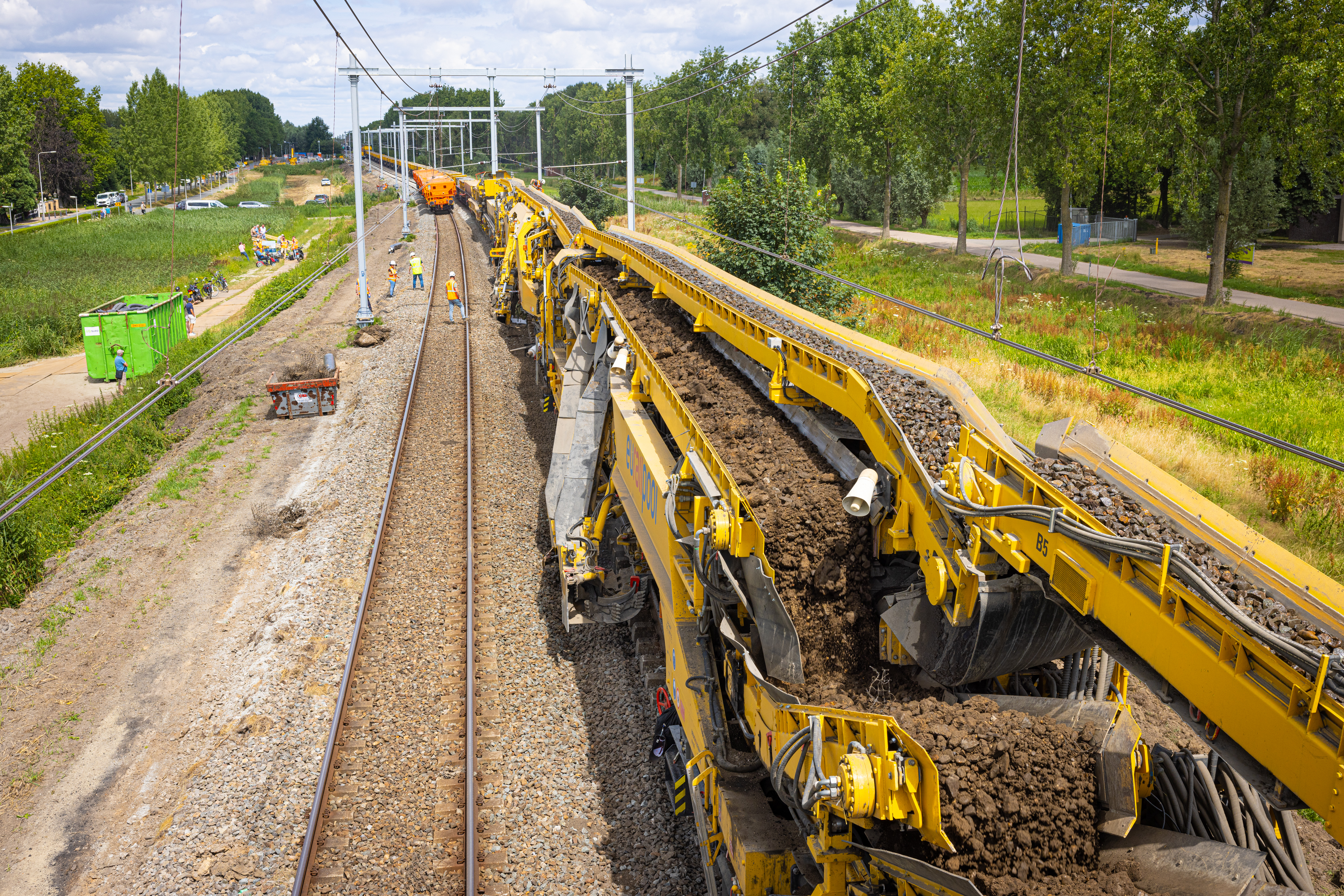 De afgelopen 23 dagen is de grond onder het spoor bij Culemborg vervangen door een nieuwe stabilisatielaag. Deze laag voert het regenwater beter af. Met de indrukwekkende werktrein PM1000-URM heeft aannemer Swietelsky dag en nacht gewerkt om het traject tussen Utrecht en Den Bosch klaar te maken voor de toekomst. Binnenkort is de snelheidsbeperking van 100 kilometer per uur waar treinen de afgelopen tijd mee te maken hadden, eindelijk van de baan.