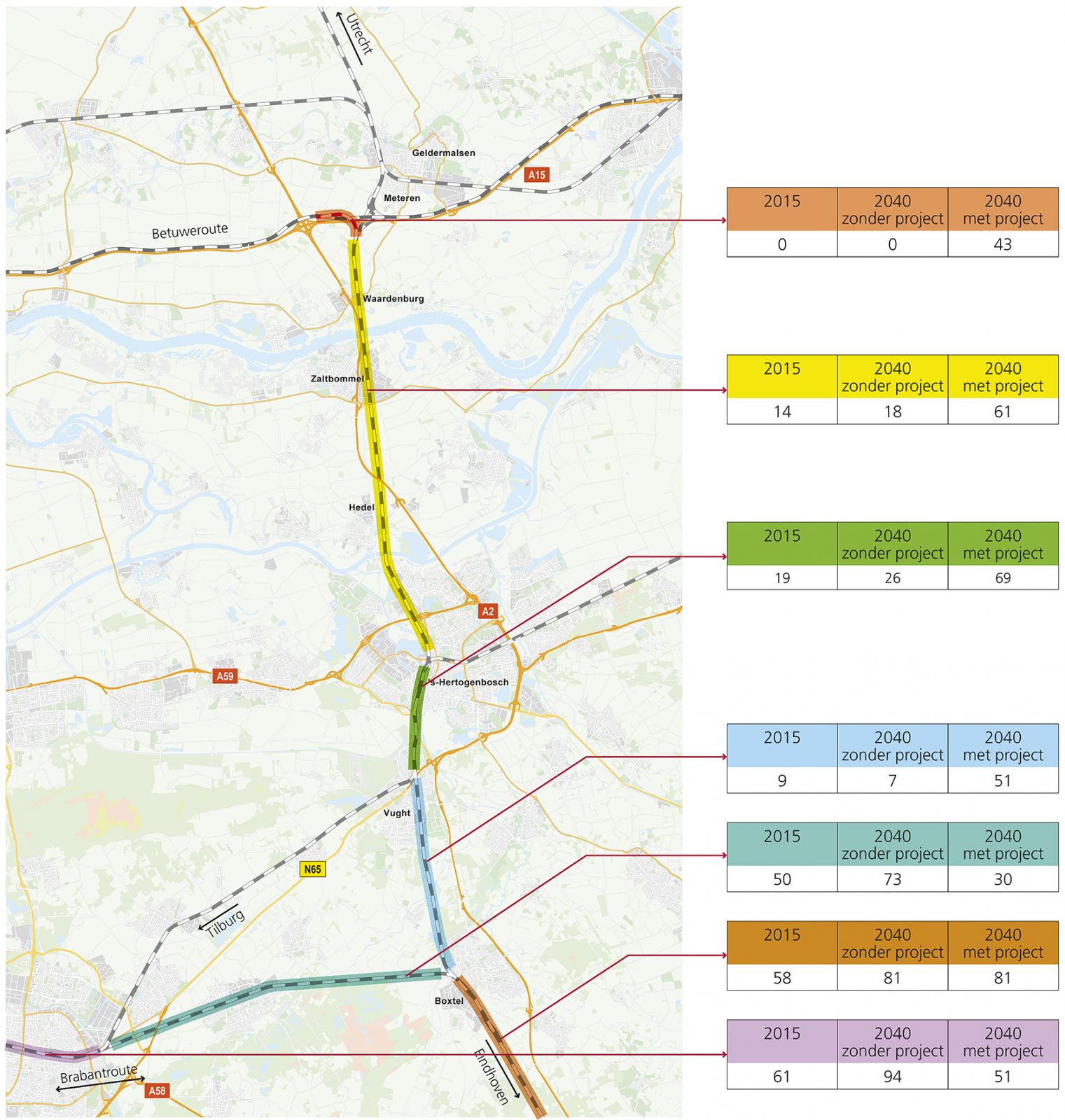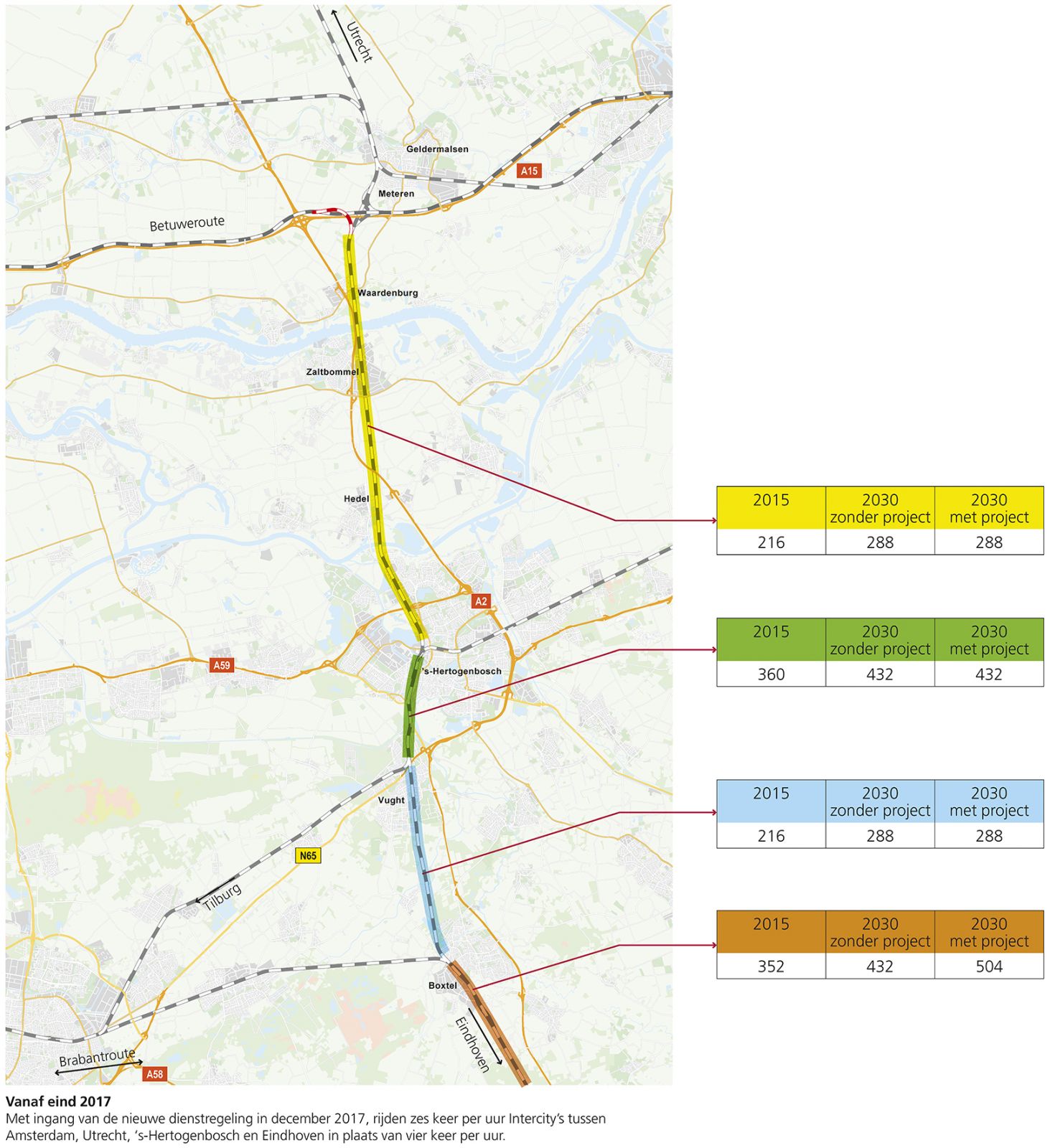 - Vanaf december 2017 gaan er twee extra intercity’s per uur rijden tussen Amsterdam, Utrecht, ‘s-Hertogenbosch en Eindhoven. Deze uitbreiding is niet afhankelijk van het project. We gebruiken het verwachte aantal reizigerstreinen in 2030 voor de onderzoeken.