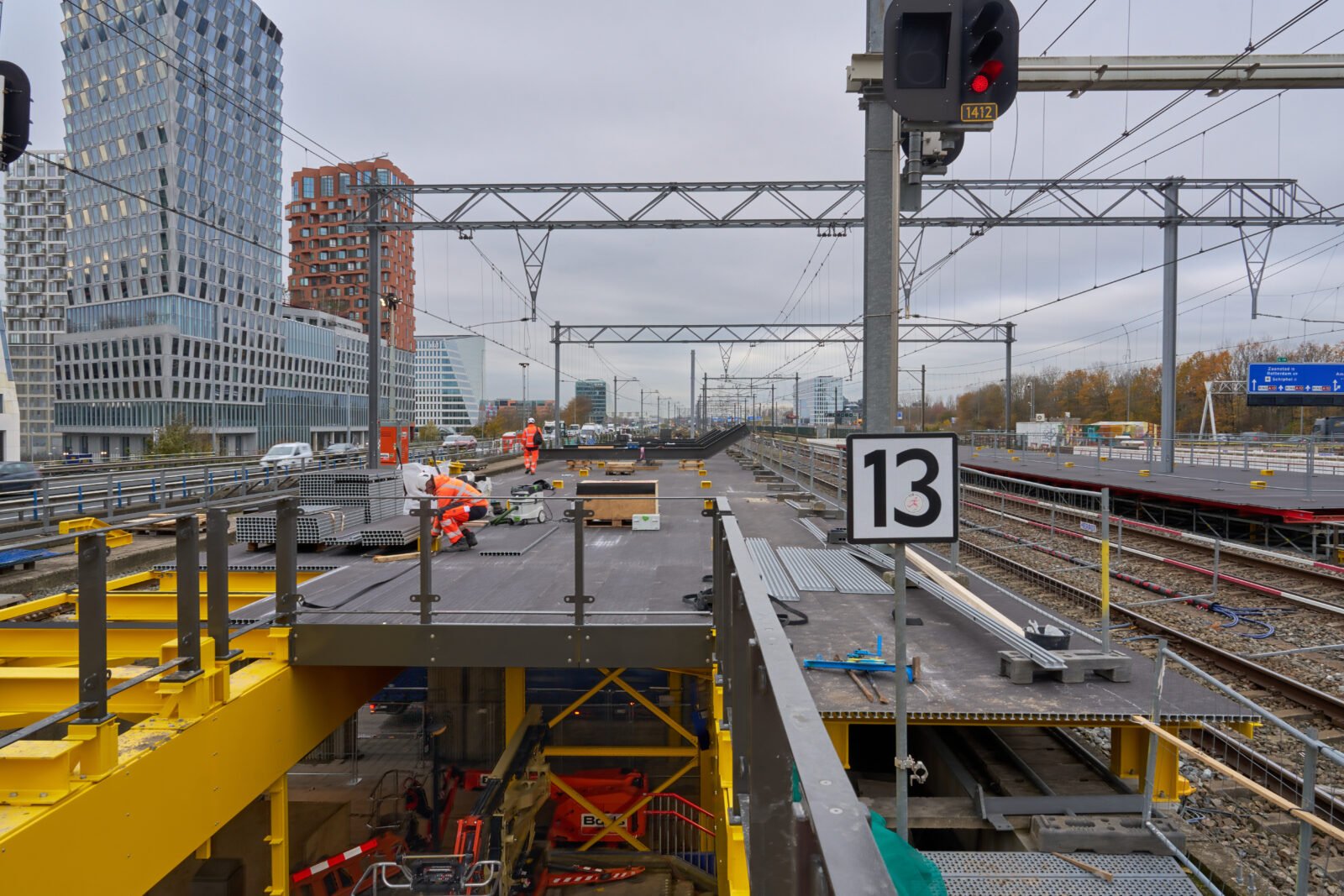 Om meer ruimte te maken voor reizigers, heeft Bouwcombinatie Nieuw Zuid (in opdracht van Zuidasdok) de afgelopen maanden de treinperrons aan de westzijde met zo’n 100 meter verlengd. Deze tijdelijke verlenging tot boven de Parnassusweg is voorzien van kappen om het reizigers zo comfortabel mogelijk te maken. Aan de oostzijde, boven de huidige reizigerspassage, gaat ongeveer diezelfde lengte juist van het treinperron af.