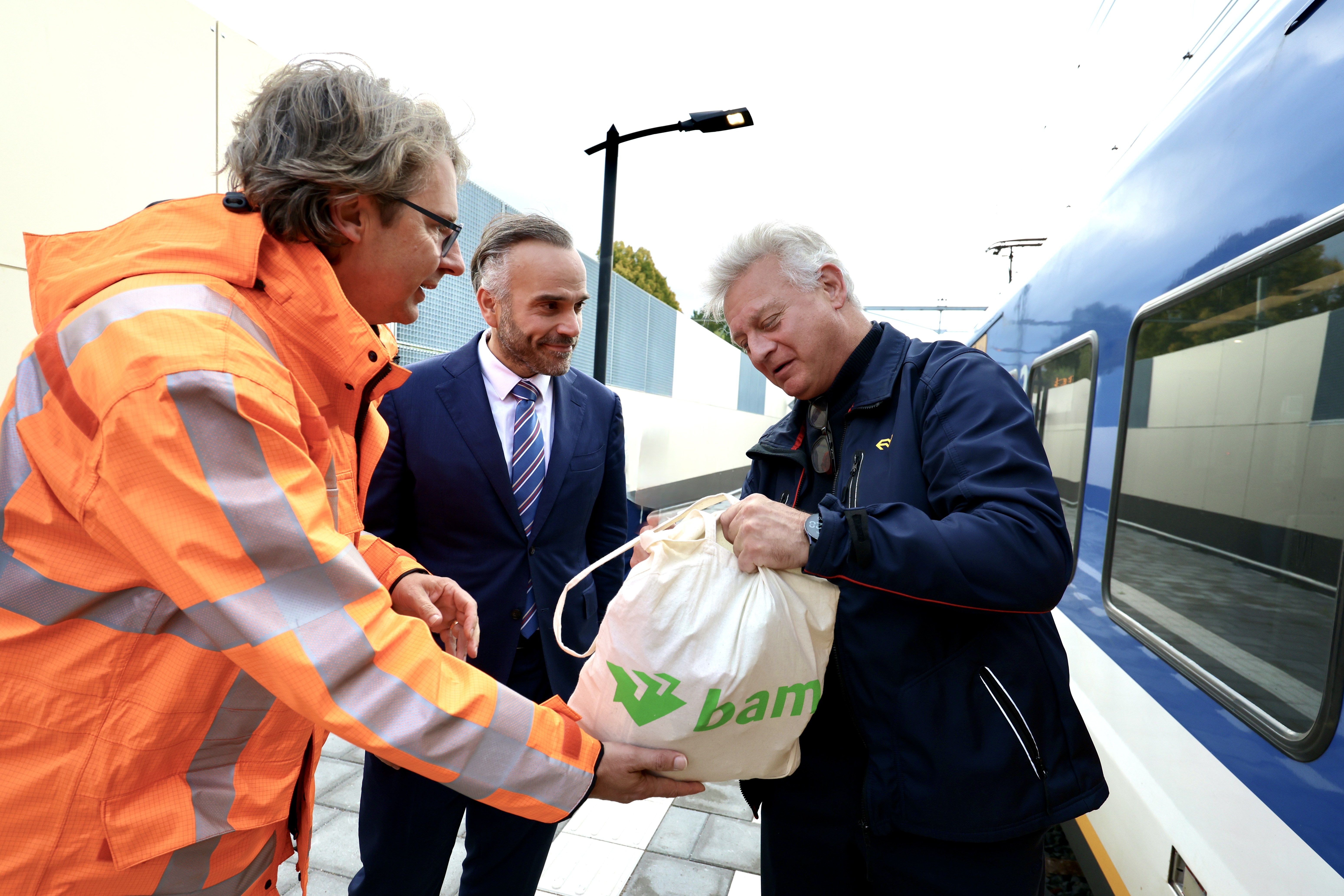Dimitri Kruik, regiodirecteur bij ProRail, ontving samen met wethouder Mark du Maine in Vught de eerste trein met een tas koeken van aannemer BAM. Projectmanager Ton Bierbooms was vanmorgen vroeg al aanwezig op het tijdelijke station om reizigers te informeren over de uitgestelde indienststelling.