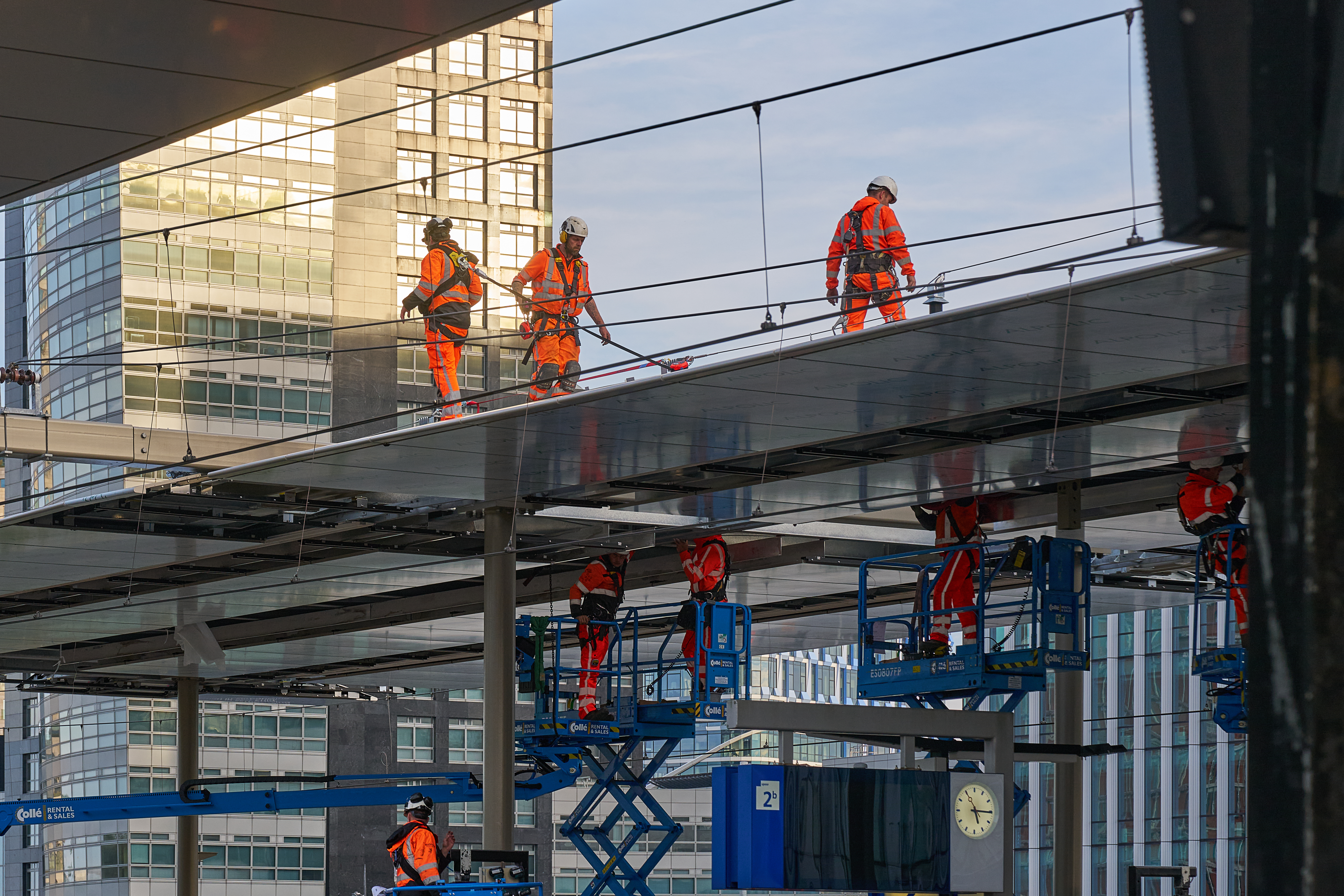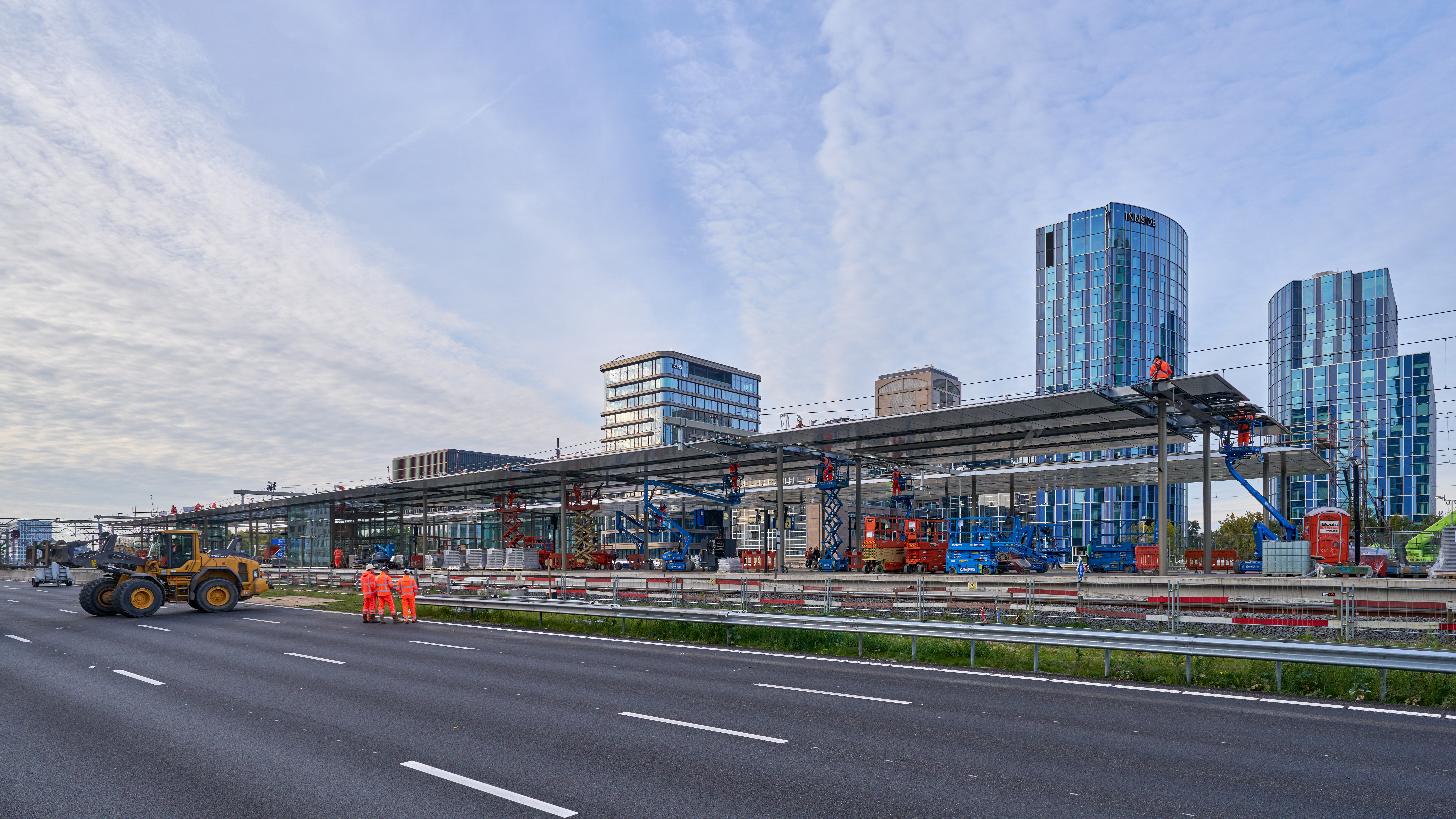 Bouwcombinatie Nieuw-Zuid (Mobilis, Boskalis en Van Gelder) hesen afgelopen weekend één voor één de enorme kapdelen vanaf de A10 Zuid naar hun plek boven het zuidelijke treinspoor van station Amsterdam Zuid. Zodra een kapdeel op zijn plaats hing, stonden tientallen bouwers klaar om het direct te monteren. Terwijl zij aan de slag gingen, reed de volgende vrachtwagen alweer het terrein op met een nieuw onderdeel: een strak georganiseerde operatie die het hele weekend doorging.