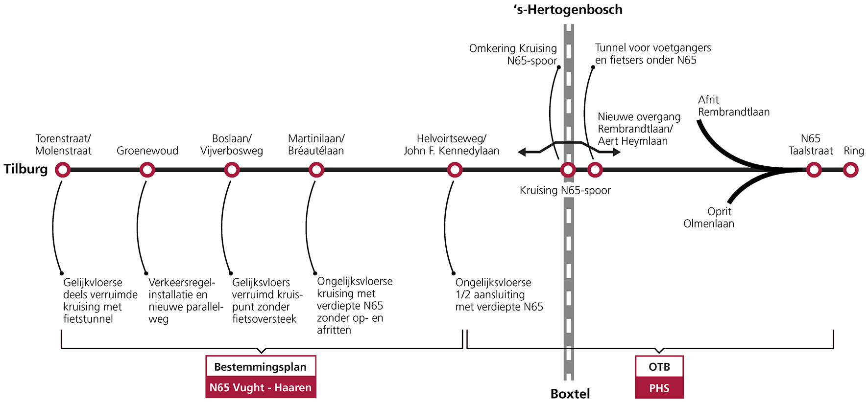 De aanpassingen die nodig zijn voor de omkering van het spoor en de N65 worden opgenomen in het Ontwerp Tracébesluit van de spooraanpassingen PHS Meteren-Boxtel. De studie voor het project N65 Vught – Haaren (project N65) voor alle overige delen wordt uitgevoerd door de gemeente Vught, de provincie Noord-Brabant en Rijkswaterstaat. Hiervoor wordt een bestemmingsplanprocedure doorlopen.