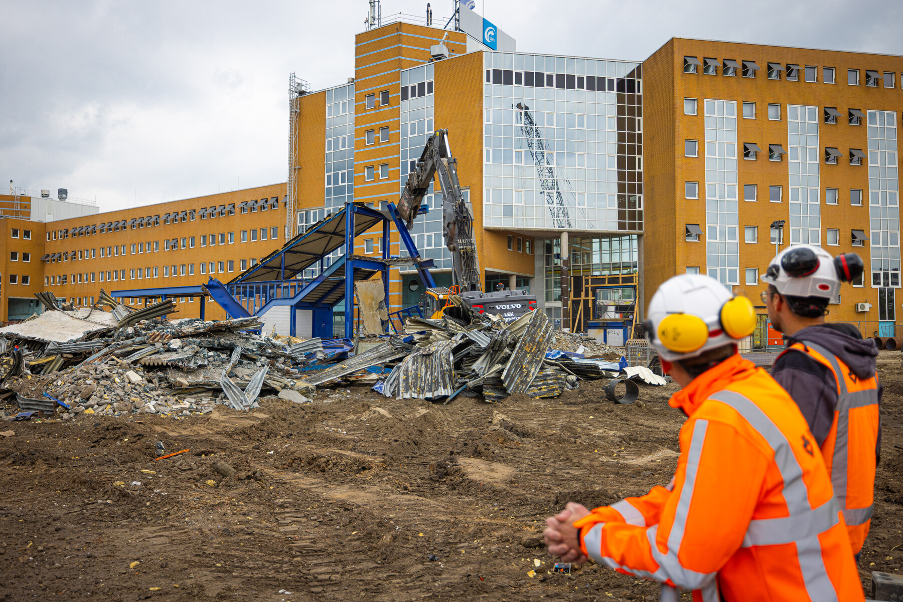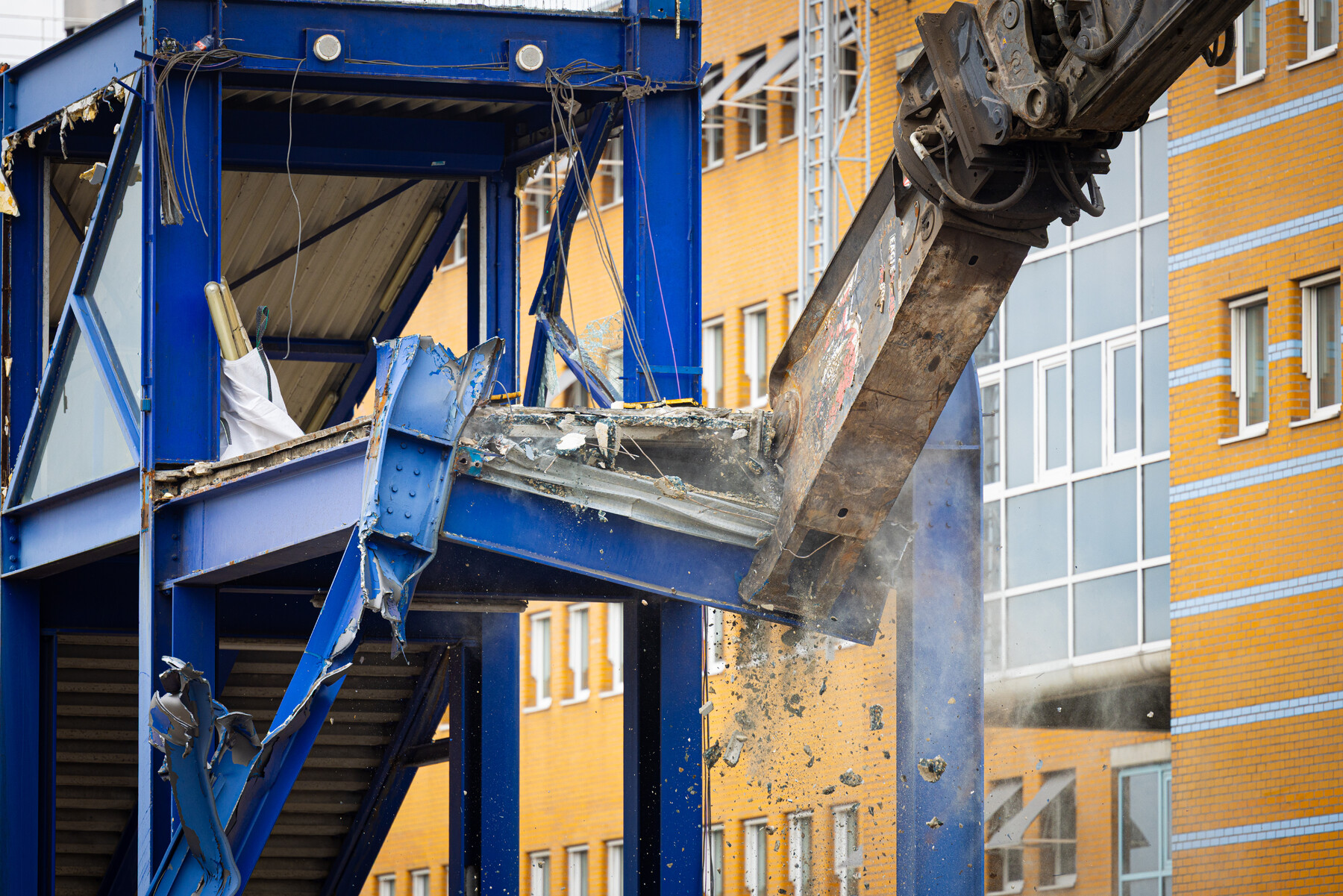 Als een schaar door papier, zo knipt een grote kraan door de blauwe brug bij station Groningen. Van de brug blijft niks over. In stukken verdwijnt ze uit het zicht. Bijna veertig jaar lang zorgde de brug ervoor dat reizigers, omwonenden en scholieren van de ene kant van het station naar de andere kant konden.