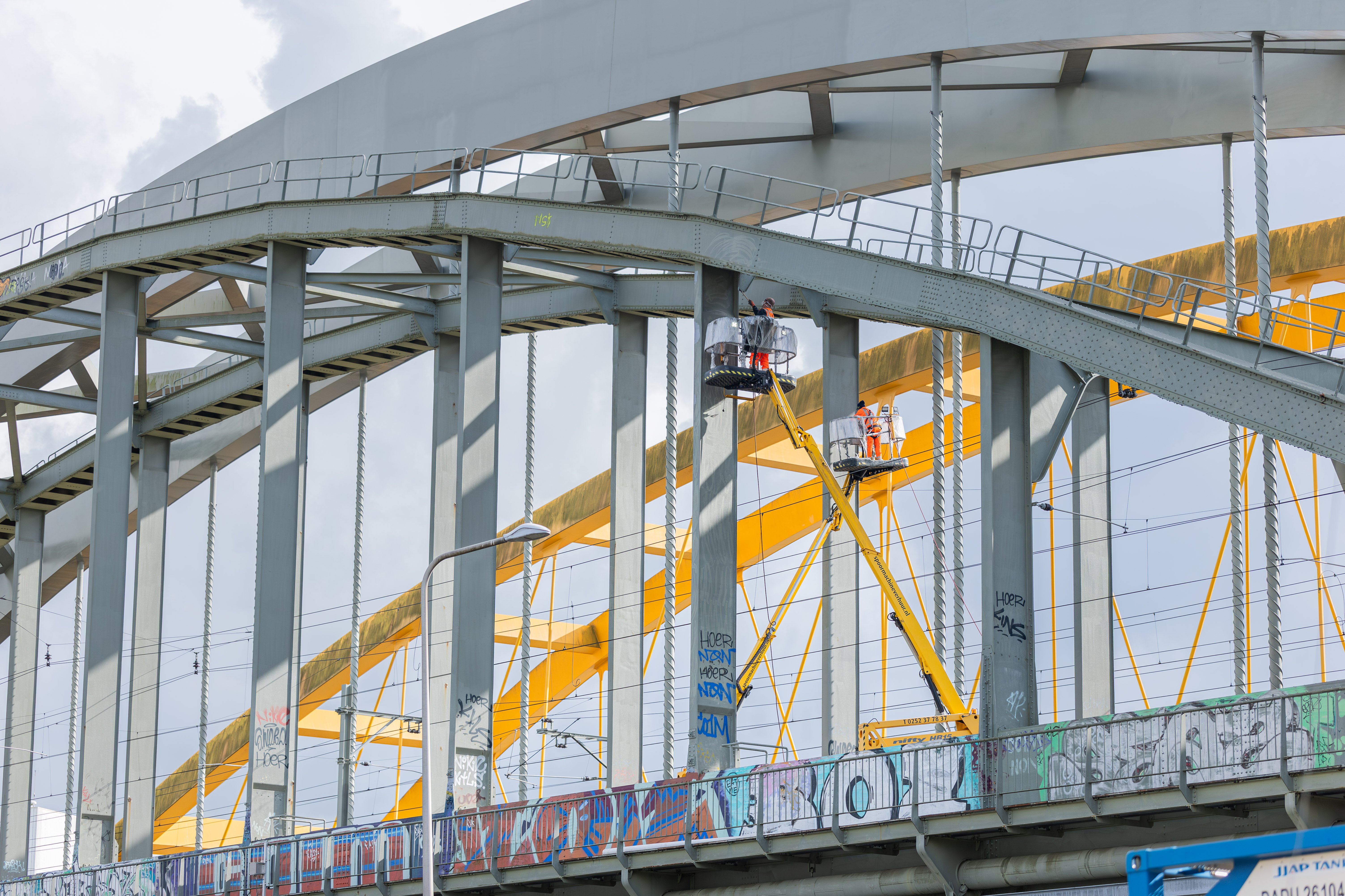 Het eerste deel van de werkzaamheden zit er inmiddels op. Admir: “Afgelopen weekend reden er geen treinen zodat we de eerste werkzaamheden dichtbij het spoor konden uitvoeren. Gelukkig hoeven we treinreizigers niet vaak te hinderen, alleen in het eerste en derde weekend van juli. Ook dan gebruiken we de tijd om veilig plekken op de brug naast het spoor te behandelen.”