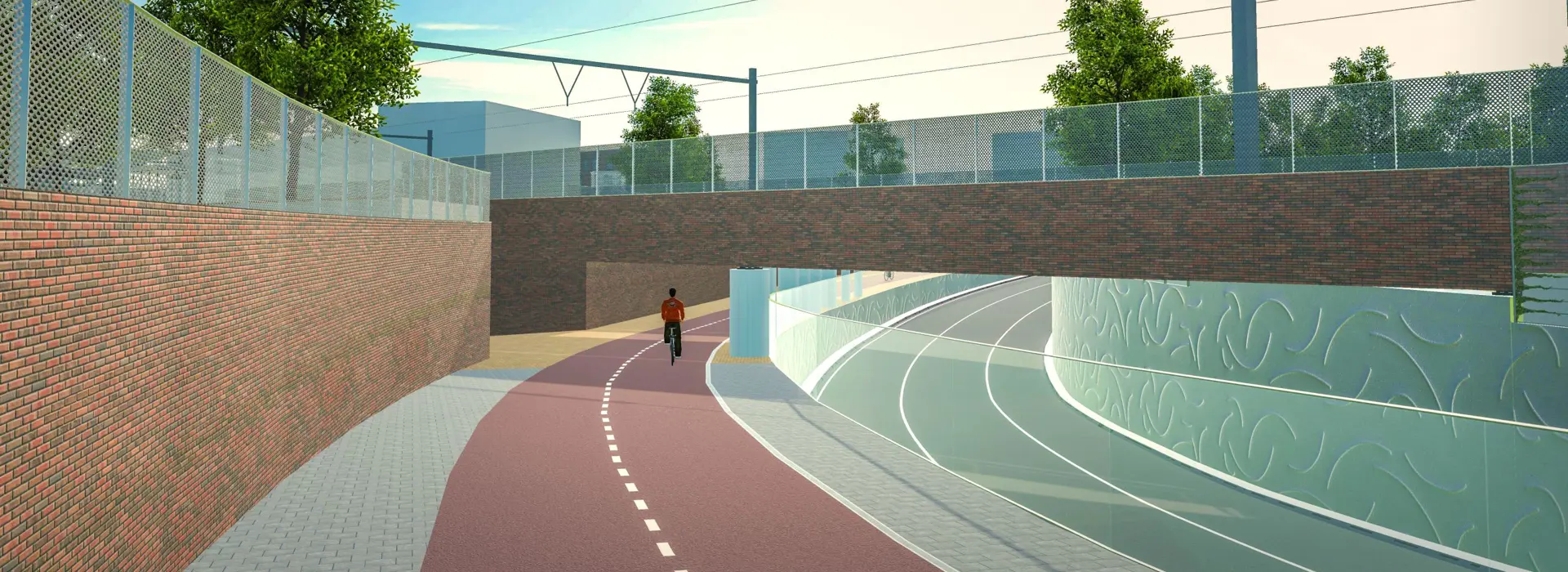 De onderdoorgang krijgt aparte paden voor fietsers en voetgangers. In de onderstaande virtuele tour is te zien hoe je straks met de auto of fiets onder het spoor door gaat.
