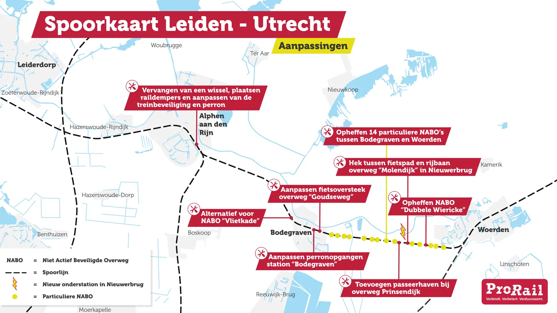 Om elk kwartier een spitstrein te kunnen laten rijden tussen Leiden-Utrecht, werken we aan de veiligheid van verschillende overwegen. Samen met de betrokken gemeentes nemen we de volgende veiligheidsmaatregelen.