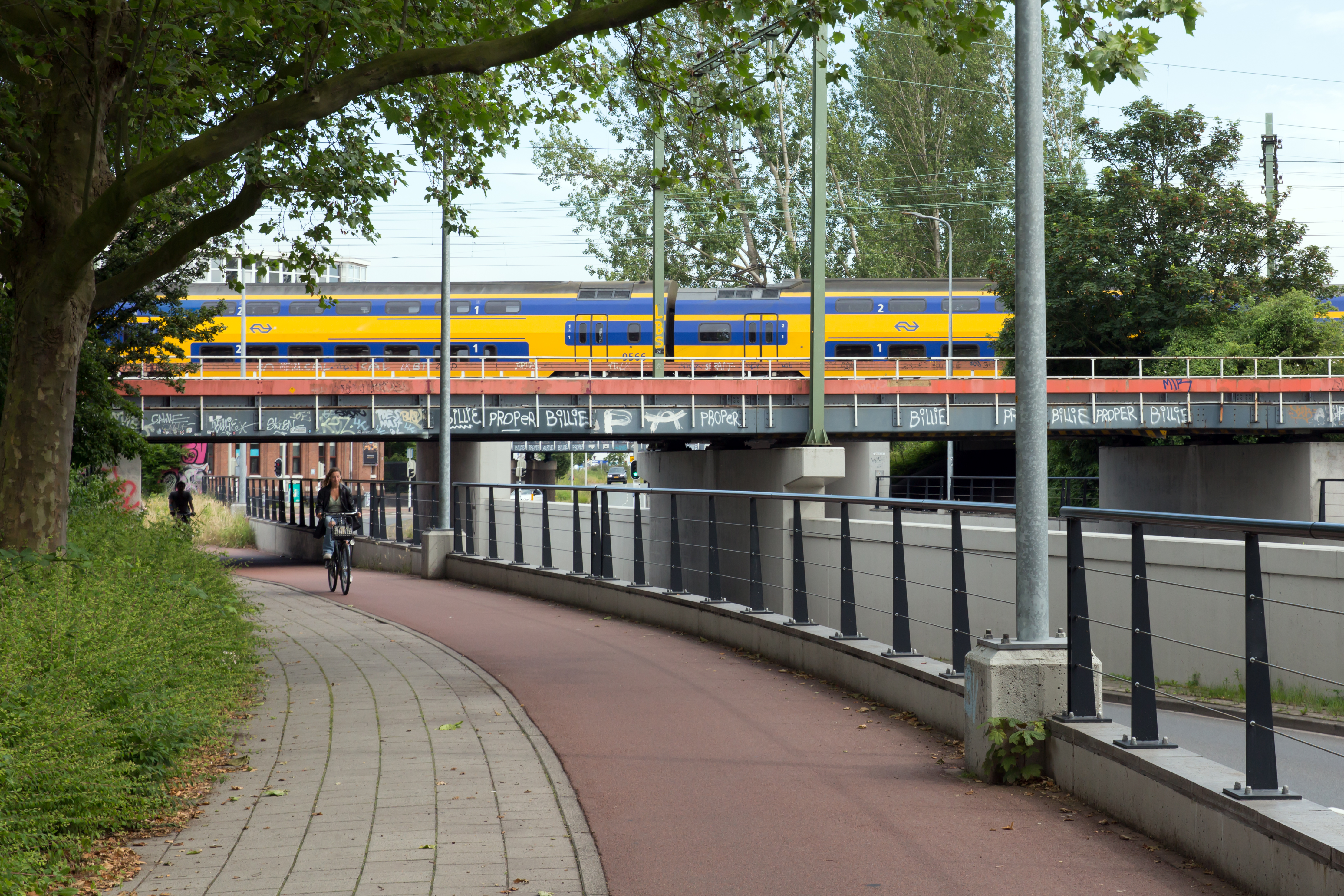 De Binkhorstlaan kruist het spoor op drie punten. De werkzaamheden vinden plaats aan de buitenste twee viaducten. We herstellen onder andere schade aan het beton. Ook gaan we de stalen draagconstructie schoonmaken en opnieuw schilderen. Dit schoonmaken doen we door reiniging met water onder hoge druk en handmatig schuren. Daarna voorzien we het staal van een nieuwe, beschermende laag.