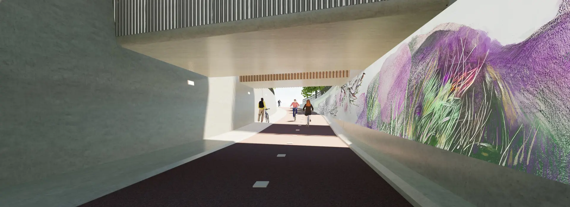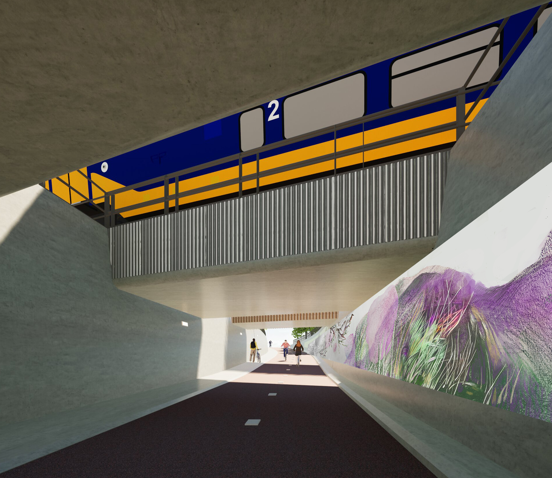 Kunstenaar Teodora Ionescu presenteert een poëtisch en gelaagd ontwerp voor de fietstunnel in Maarsbergen. In haar voorstel, getiteld Wortels die vertellen, vormen fragiele wortelstructuren de basis van een visuele reis door landschap, herinnering en verbondenheid. Het ontwerp transformeert de tunnel tot een beleving. Geen kille doorgang, maar een ruimte waarin bezoekers worden ondergedompeld in een verhaal van wortels, dieren, planten en kleur. De wortels staan symbool voor identiteit en herinnering – ze verbinden ons met het verleden én met elkaar.