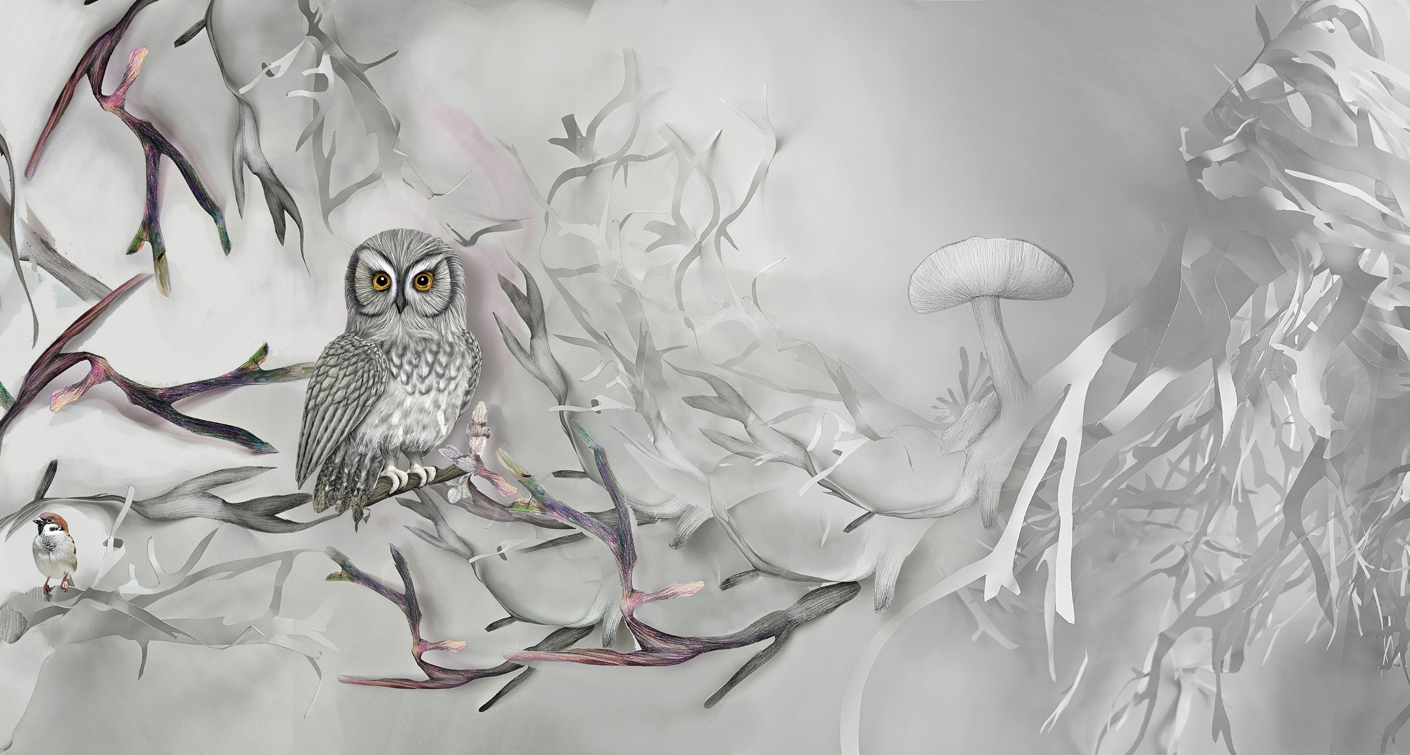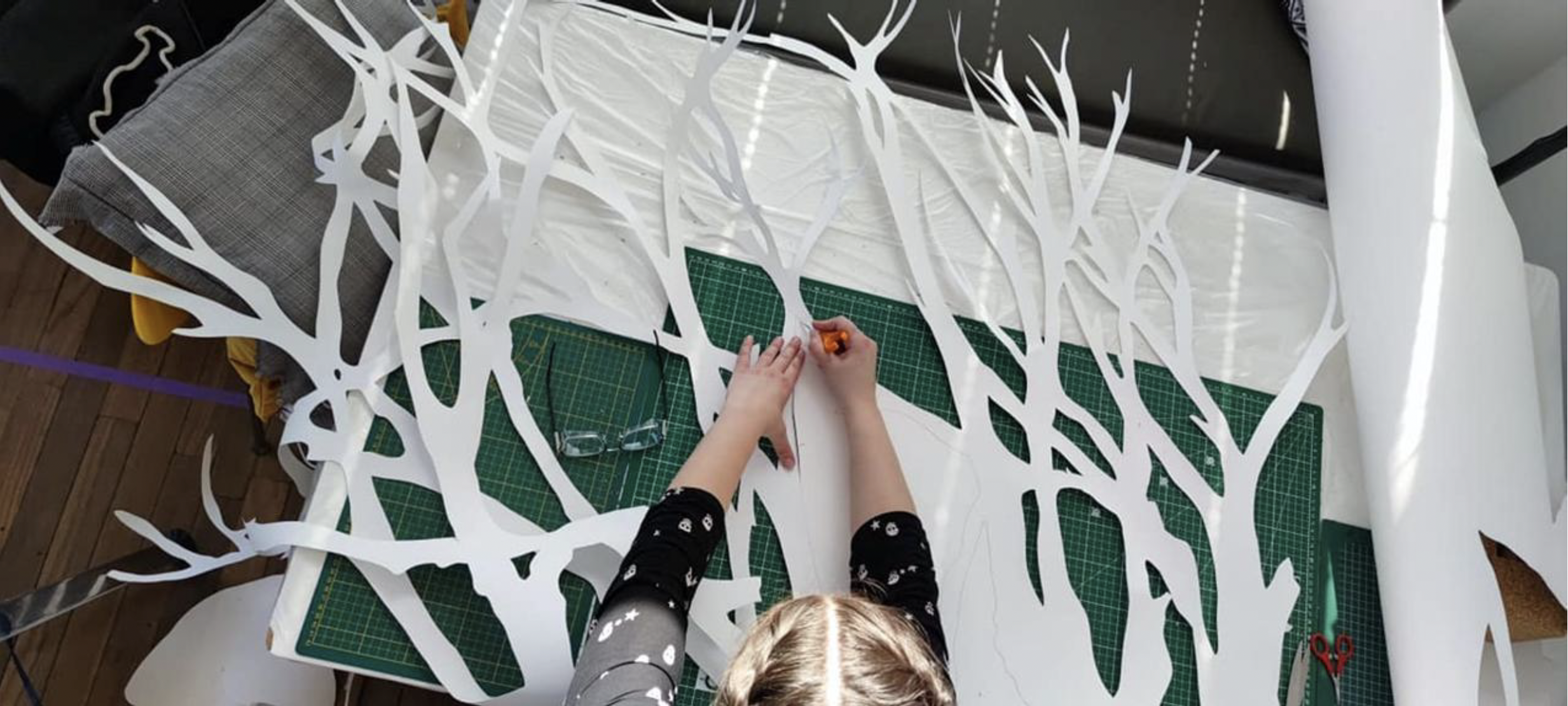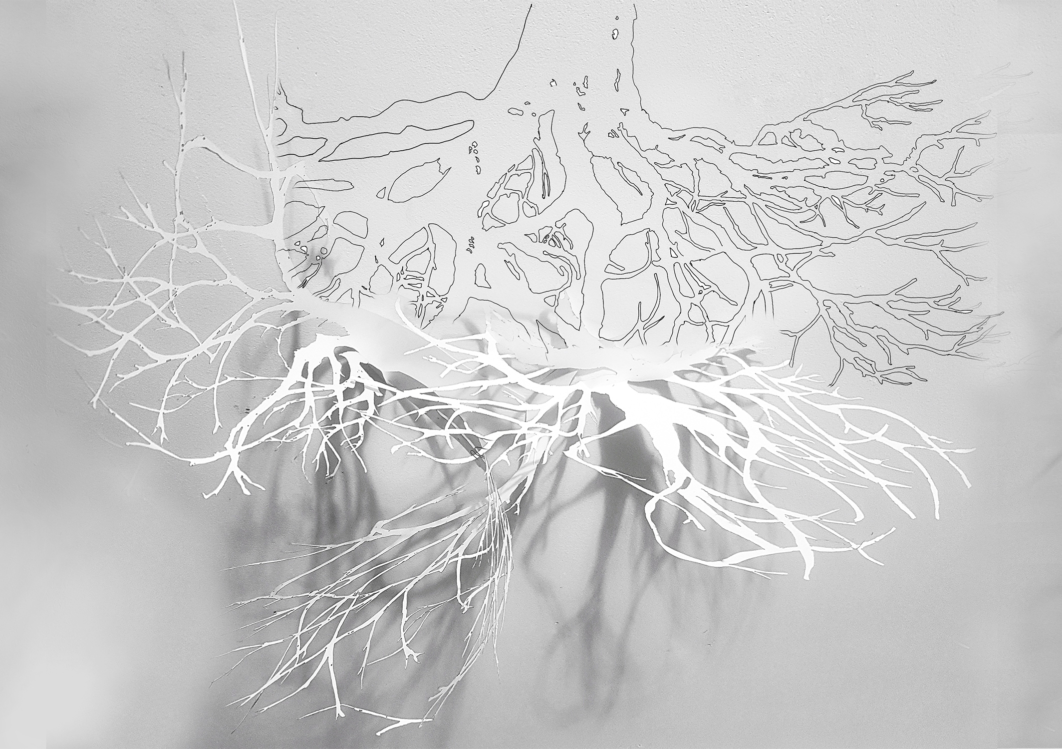 Teodora maakt een ontwerp, knipt alle wortels helemaal uit. Daarna fotografeert zij het werk en maakt het geschikt voor een groot formaat. Het ontwerp is opgebouwd uit: tekeningen van wortelstructuren, 3D-papier cut-outs die diepte en fragiliteit tonen, texturen van kleurpotlood en aquarel, fotografie om licht en compositie te onderzoeken en digitale bewerking.