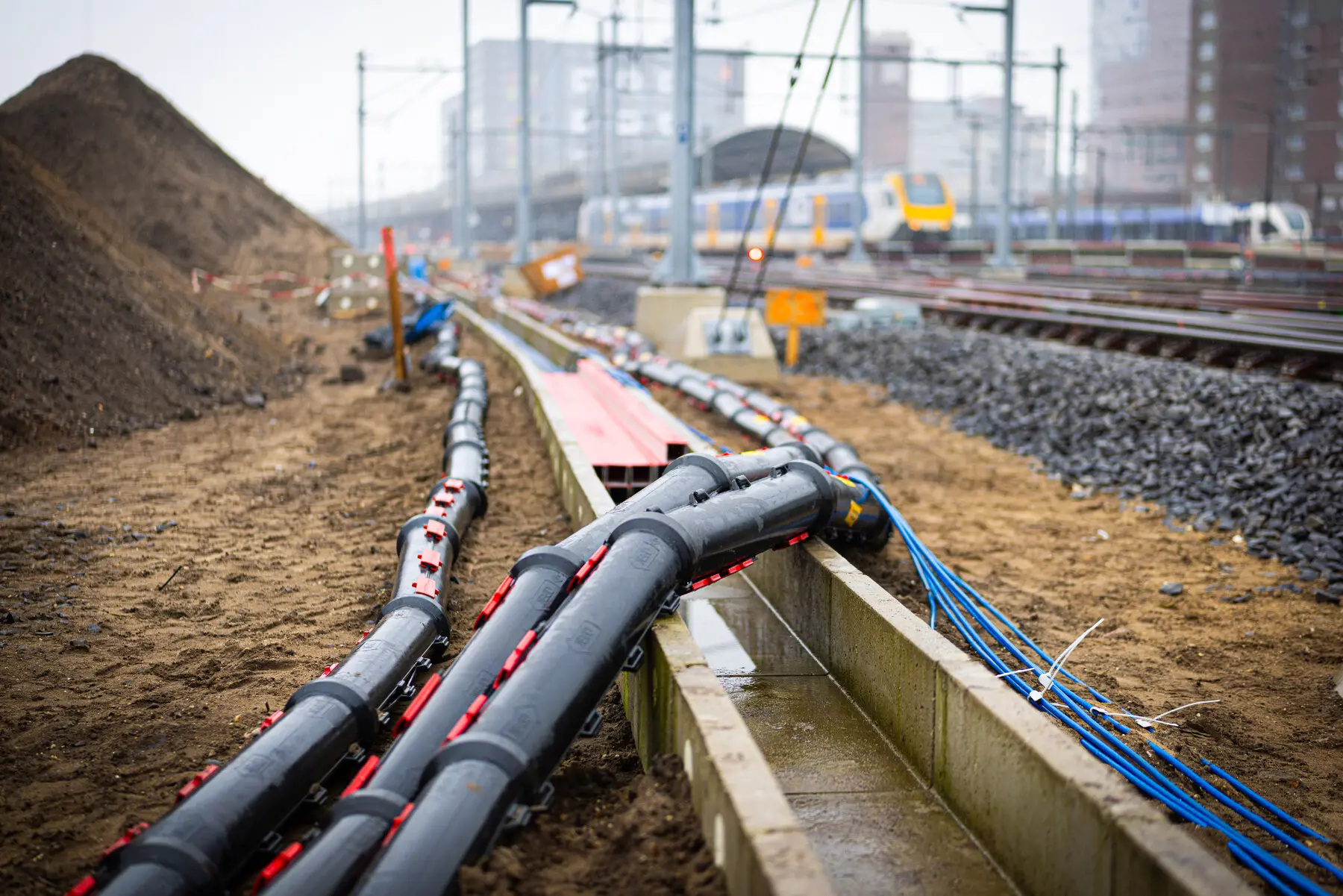Daarnaast zetten we materialen tijdelijk in om ze na afloop weer beschikbaar te maken voor hergebruik elders. Een goed voorbeeld hiervan is het koper dat vrijkomt uit de oude bovenleidingsportalen. Dit wordt niet afgevoerd als afval, maar omgesmolten en opnieuw toegepast. Ook klikbuizen, die worden gebruikt om kabels en leidingen tijdelijk te beschermen, worden projectoverstijgend hergebruikt.