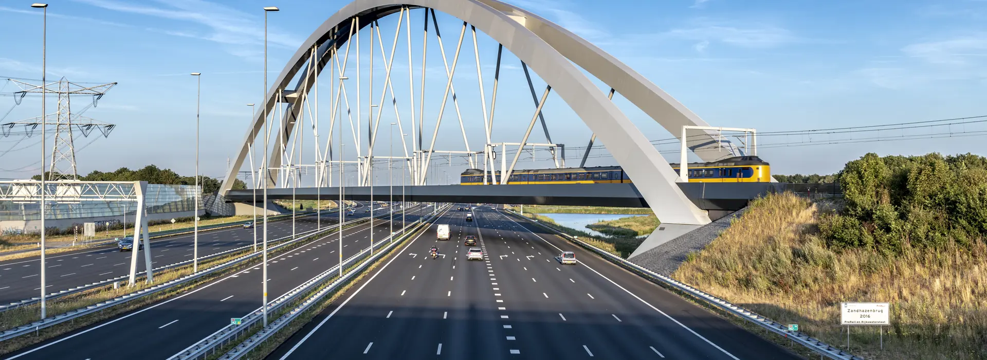 Het hazenpad kiezen? Dat kan ook met de trein. Via de Zandhazenbrug loopt het spoor over knooppunt Muiderberg. En die spoorbrug is een knap staaltje vakwerk.