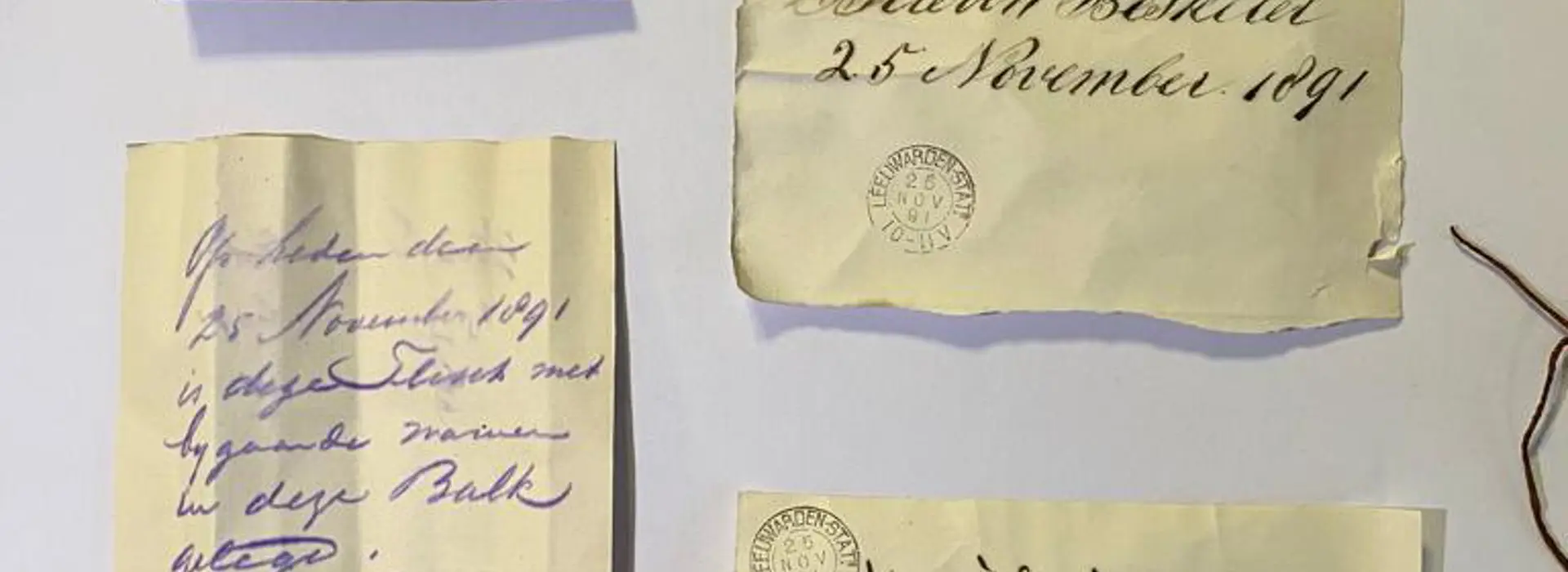 Op 25 november 1891 schrijft Jan een korte tekst op de achterzijde van een verzendbewijs dat gebruikt wordt voor poststukken. Hij ondertekent deze met zijn naam en zet zijn functie eronder. Conducteur der Groningen. Het briefje met daarop de tekst “Op heden deze 25 november 1891 is deze flesch met bijgaande papieren in deze Balk gelegd.” wordt afgestempeld. Samen met drie andere briefjes worden ze in een lege fles gestopt en in de holte van de ijzeren balk gelegd die in het kantoor door de muur steekt.